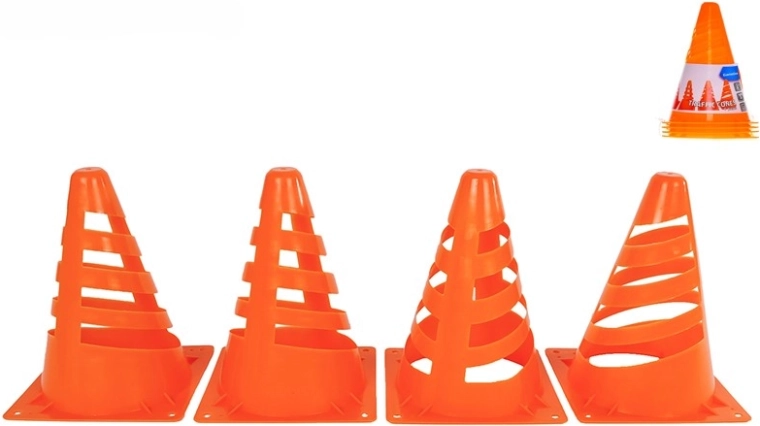Kužele majú rozmery 13 × 13 × 18 cm a sú vybavené montážnymi otvormi na rýchle upevnenie či prepojenie s tyčami a ďalšími tréningovými prvkami. Sú vhodné pre deti od 5 rokov a uplatnia sa pri didaktických hrách, ktoré rozvíjajú koordináciu, rýchlosť a motorické zručnosti.