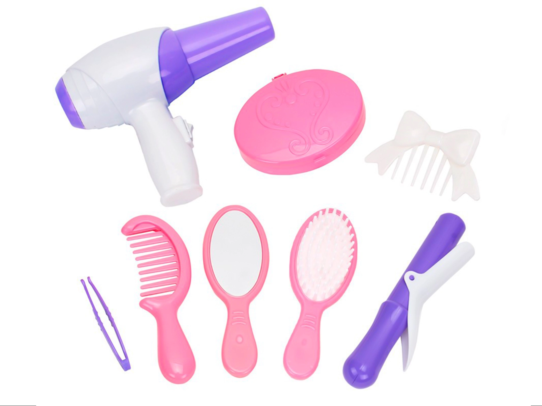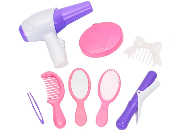 - Fén, kulma, hrebeň, kefa, zrkadielko, hrebienok s mašľou, púdernička, pinzeta