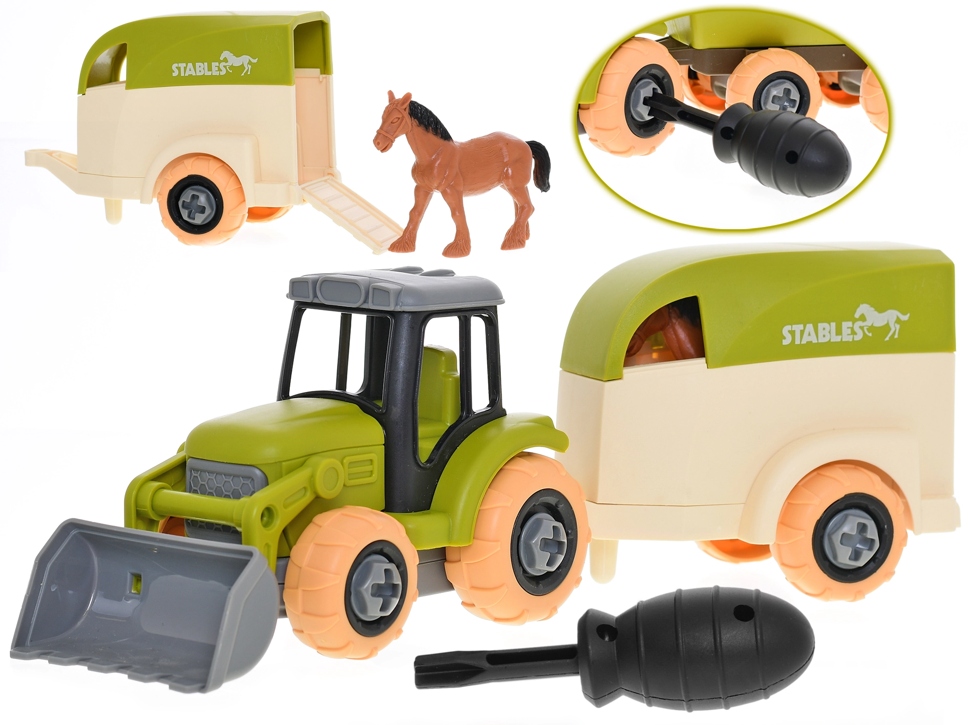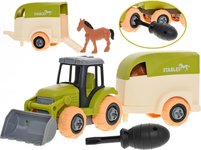 Skrutkovací traktor s prívesom a figúrkou koňa s dĺžkou 26 cm je skvelá hračka pre malých farmárov. Deti si môžu vozidlo samy zostaviť a rozobrať vďaka skrutkovaciemu systému, ktorý rozvíja jemnú motoriku a technické zručnosti. Traktor má voľnobeh pre jednoduché jazdenie po podlahe a príves s koníkom ponúka bohaté možnosti hry a podporuje fantáziu.
