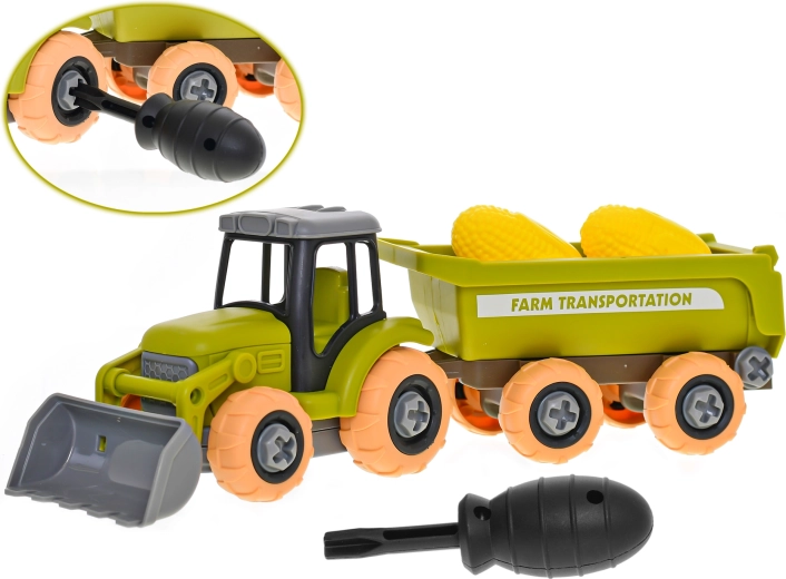 Tento detailne spracovaný traktor s vlečkou je navrhnutý tak, aby bavil a učil. Deti si pomocou priloženého skrutkovača môžu jednotlivé časti bezpečne rozobrať a znova zložiť, čím trénujú koordináciu rúk a očí aj logické myslenie. Odnímateľná vlečka a dvojica klasov kukurice podporujú kreatívne hranie a spoznávanie sveta poľnohospodárstva.
