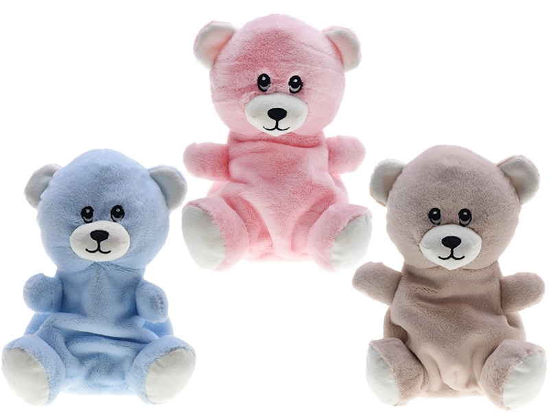 Vyberať môžete z troch obľúbených farieb – béžovej, ružovej a modrej. Medvedík je vyrobený z mäkkého plyšu, ktorý je príjemný na dotyk a zároveň jednoducho udržiavateľný pre každodennú hygienu.