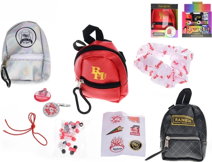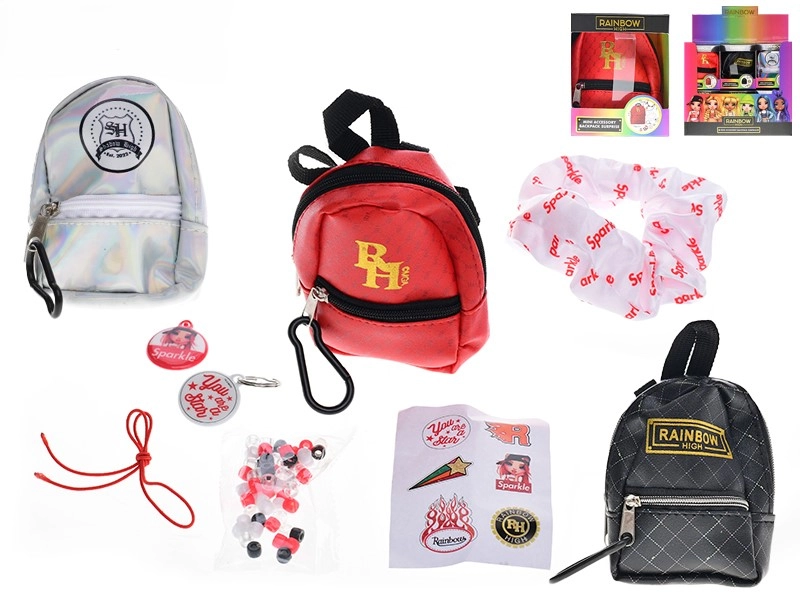 - mini batoh, gumička do vlasov, farebné koráliky, prívesky s logom RAINBOW HIGH