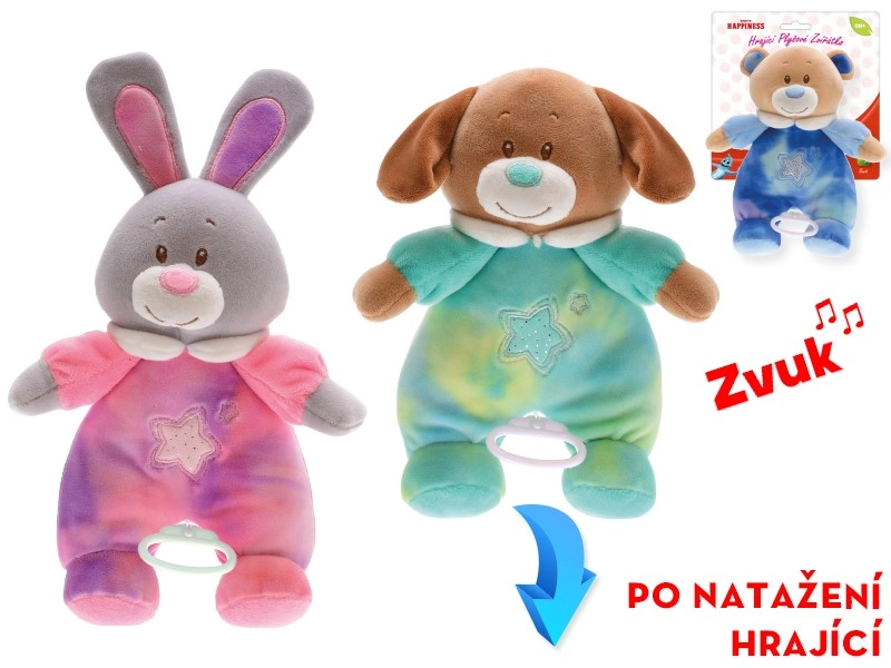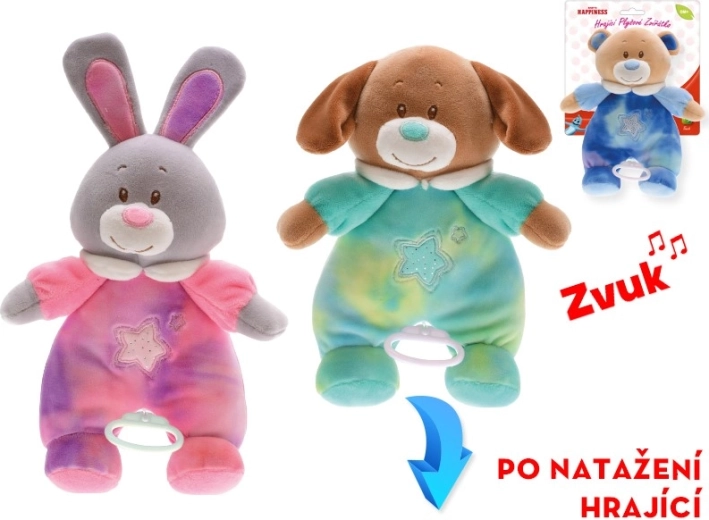 Roztomilé plyšové zvieratko Baby Happiness s veľkosťou 26 cm je ideálne pre bábätká od narodenia. Po natiahnutí prehrá jemnú upokojujúcu melódiu, ktorá podporuje sluchové vnímanie, a vďaka mäkkučkému plyšu rozvíja aj hmat. Štýlový oblečok z neho robí krásny doplnok do detskej izbičky. Dostupné vo variantoch medvedík, psík a zajo.