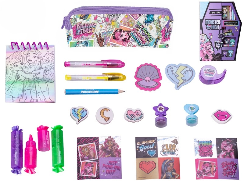 - pastelky, fixky, ceruzky, samolepky s postavami Monster High