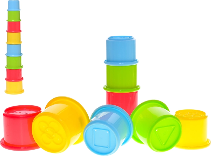 Objavte zábavnú sadu ôsmich farebných kalíškov, ktoré možno ľahko skladať do stabilnej veže. Hračka je ideálna pre deti od 6 mesiacov a podporuje rozvoj jemnej motoriky, koordinačných schopností a logického myslenia. Vďaka rôznym veľkostiam a farbám sa deti učia rozpoznávať farby a tvary, zatiaľ čo reliéfny povrch kalíškov stimuluje hmatové vnemy. Ľahký a odolný plast zaručuje jednoduchú manipuláciu a praktická sieťka uľahčuje prenášanie a skladovanie.