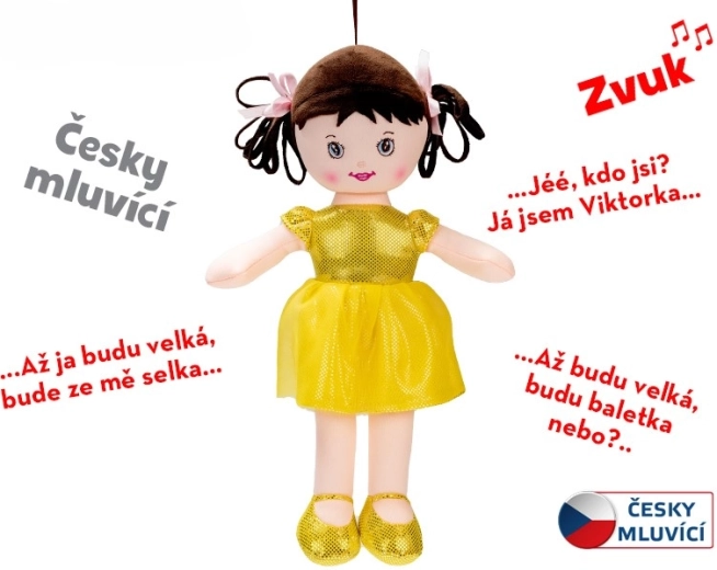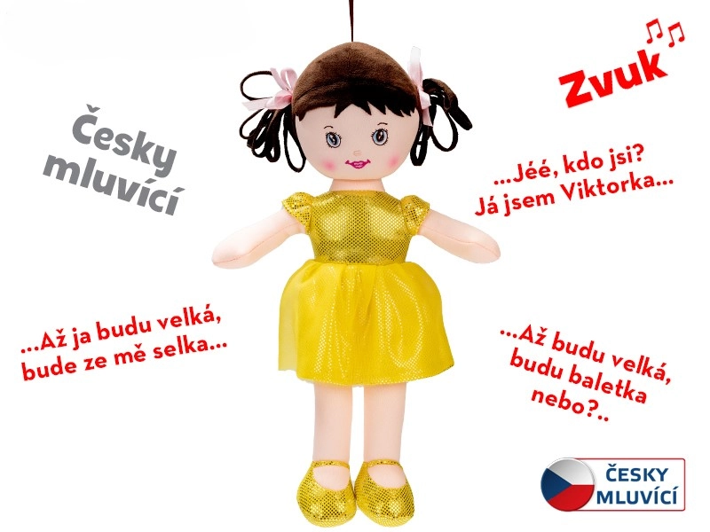 Roztomilá bábika Viktorka s veľkosťou 32 cm poteší každú malú princeznú svojím mäkkým textilným telíčkom a lesklými žltými šatočkami. Je ideálna na mojkanie a prvé hry, je totiž jemná na dotyk a vhodná už od narodenia. Po stlačení hovorí a spieva v češtine, čo prirodzene podporuje rozvoj reči. Batérie LR44 sú súčasťou balenia, takže sa deti môžu hrať hneď.