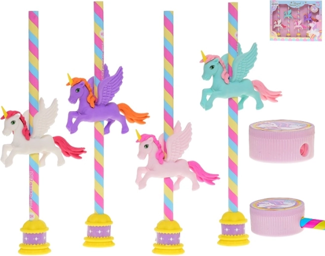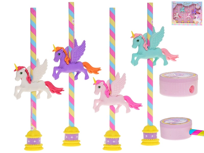 Sada ceruziek Jednorožec je ideálnou voľbou do školského peračníka aj na domáce tvorenie. Štyri drevené ceruzky s tvrdosťou HB zabezpečujú hladké písanie bez šmúh, integrované gumy umožnia rýchle opravy a priložené strúhadlo udrží hroty vždy ostré. Hravé motívy jednorožcov vnesú do každého dňa porciu fantázie.