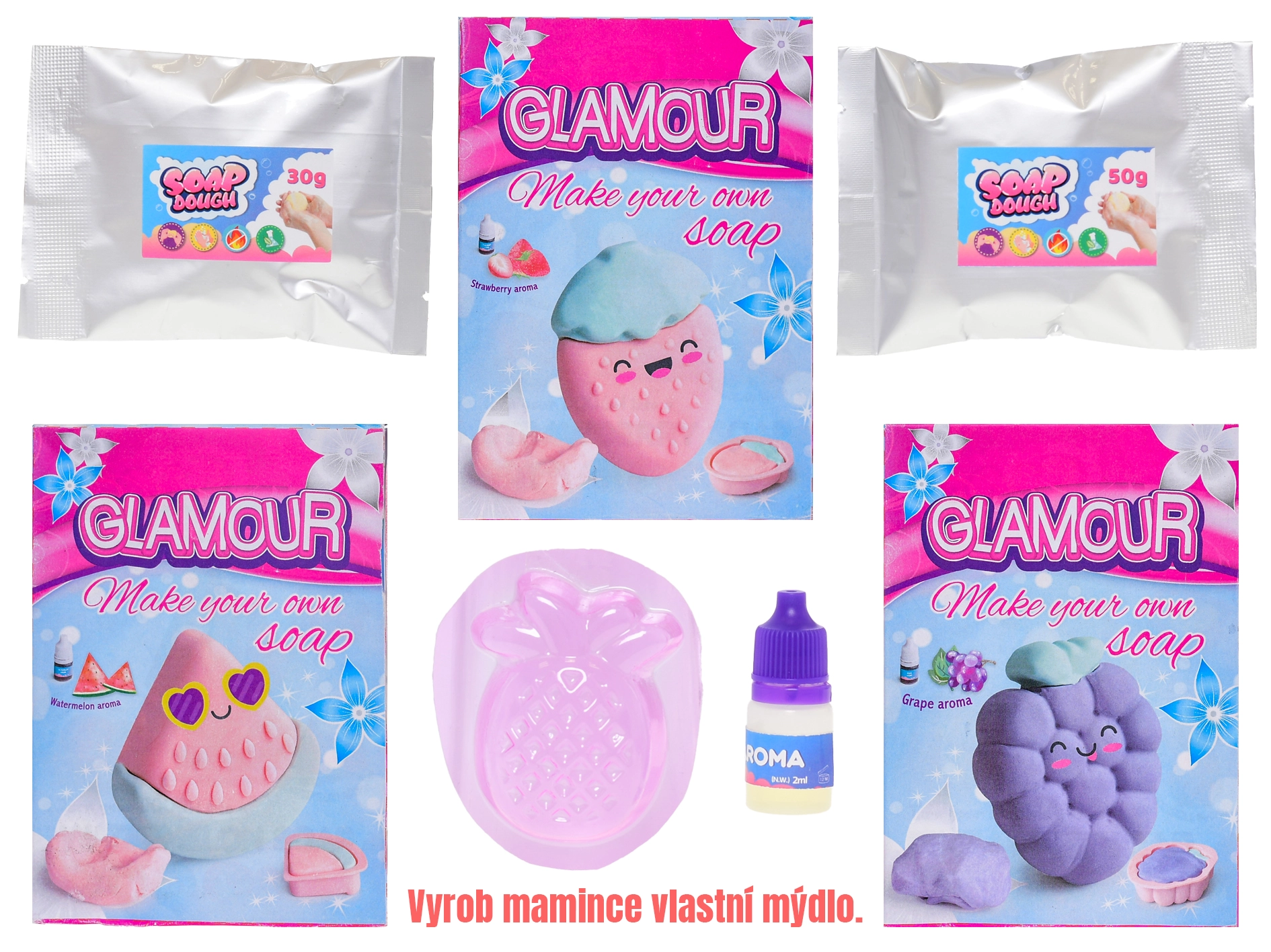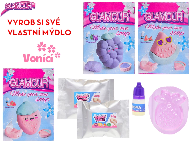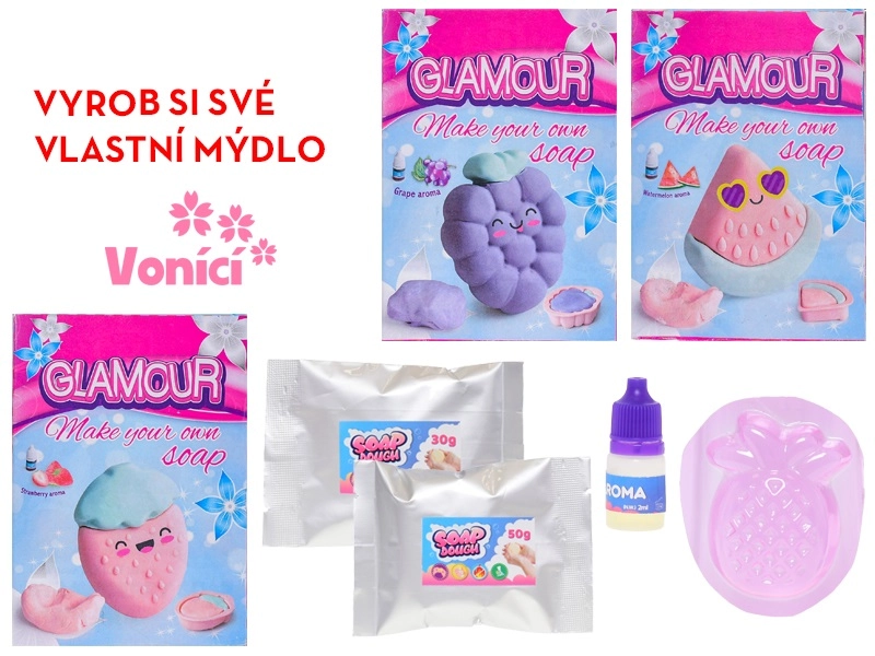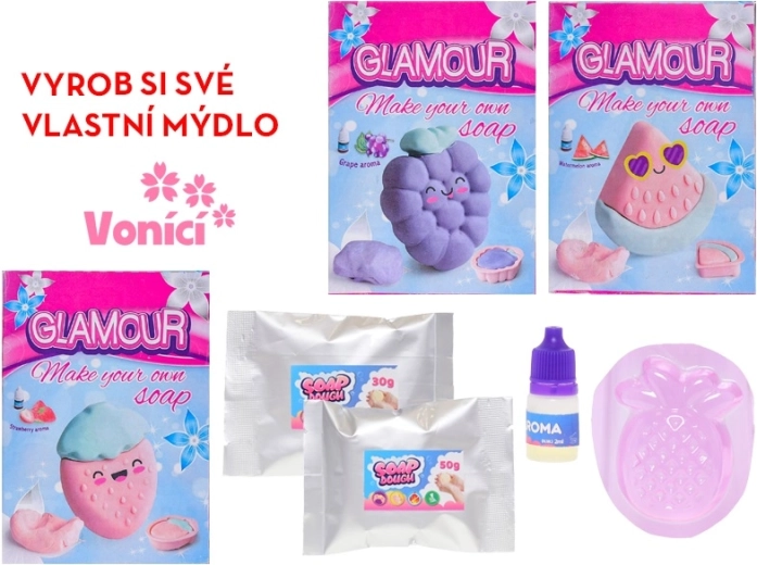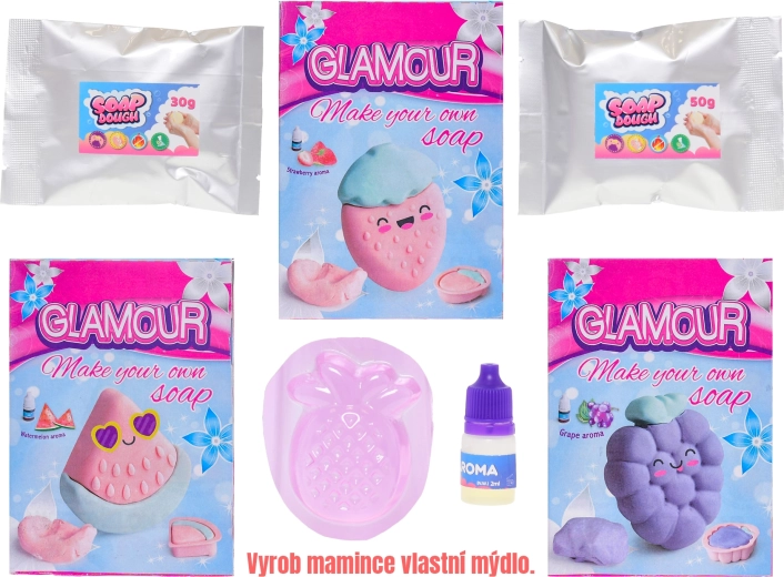 Objavte zábavnú sadu pre malých tvorcov: s Glamour hmotou si deti ľahko vyrobia vlastné voňavé mydlo. Sada podporuje kreativitu a jemnú motoriku, ponúka štyri ovocné vône – ananás, hrozno, melón a jahoda – a je vhodná pre deti od 4 rokov.