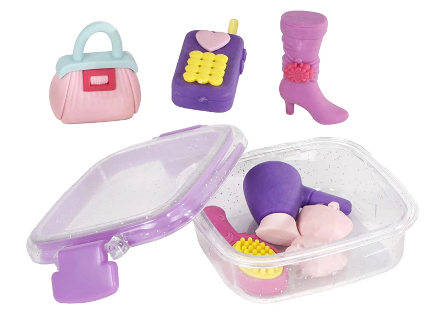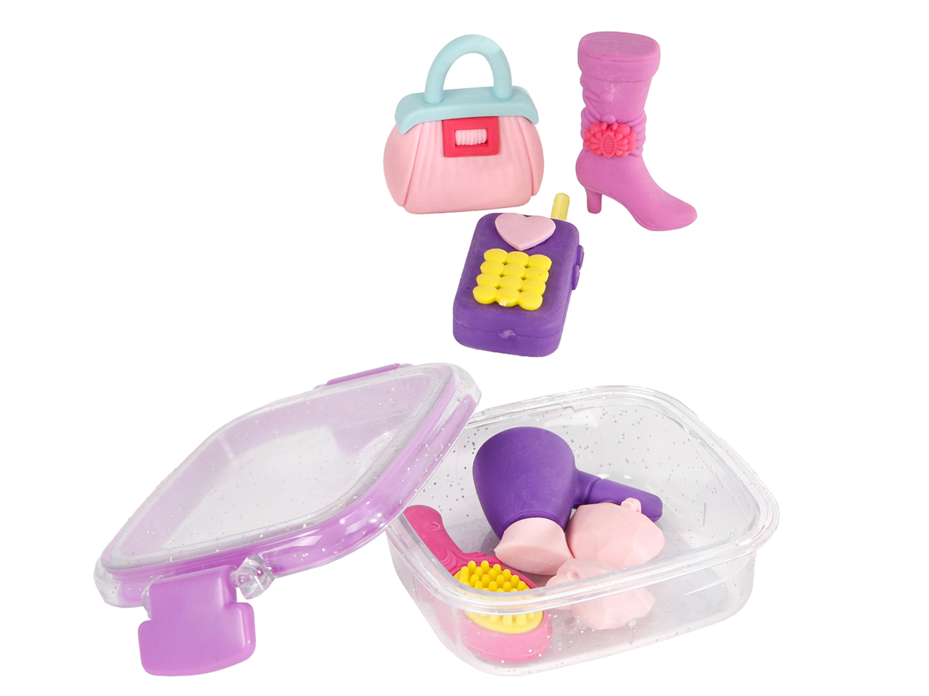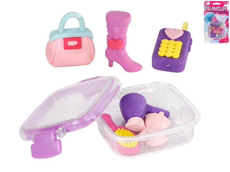 Štýlová Glamour sada gúm prináša zábavu aj praktickosť do školského peračníka. Obsahuje 8 originálnych gúm v tvare módnych doplnkov, ako je mobilný telefón, topánka či kabelka. Každá guma z kvalitnej pryže zabezpečuje hladké a účinné mazanie bez poškodenia papiera, je odolná a vďaka praktickej krabičke ju máte vždy po ruke. Skvelá voľba pre deti od 3 rokov.