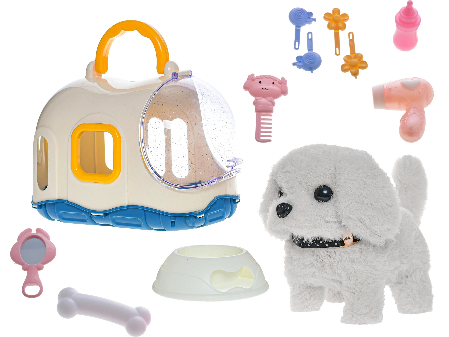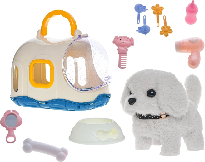 Psík je dostupný v dvoch farebných variantoch – bielom a béžovom. Odolná kombinácia plyšu a plastu zaisťuje dlhú životnosť, zatiaľ čo praktická prepravka dodáva hre autentickosť a umožňuje ľahké prenášanie na cesty či návštevy.