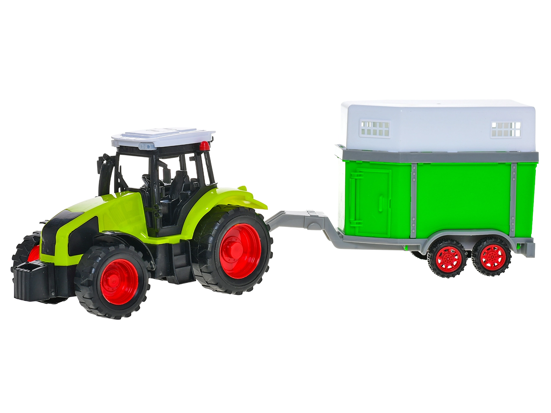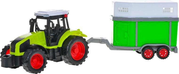 Traktor s prepravníkom pre kone je ideálna hračka pre deti, ktoré milujú farmárske dobrodružstvá. Vďaka zotrvačníkovému pohonu sa traktor pohybuje plynulo a verne napodobňuje skutočnú jazdu, čo podporuje realistickú hru a rozvoj fantázie. Príves je prispôsobený na prevoz koní, takže deti môžu vytvárať vlastné príbehy a scenáre z farmy.