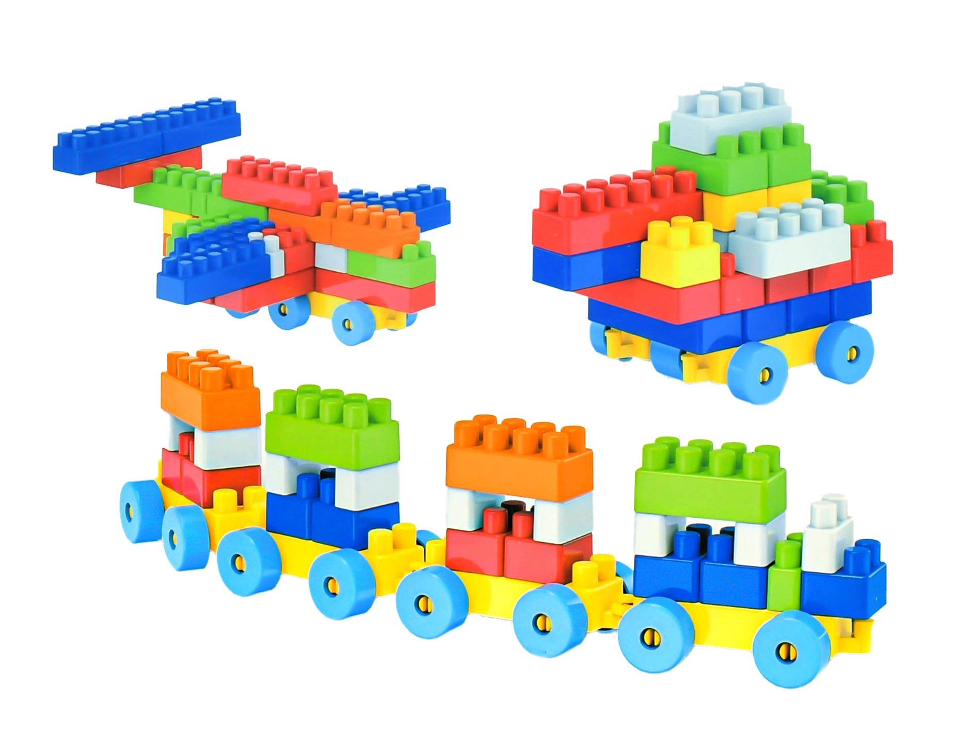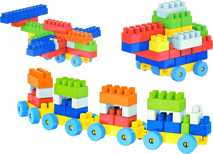 Táto univerzálna stavebnica ponúka 100 pevných plastových dielikov, vrátane podvozkov s kolesami na jednoduché vytváranie pojazdných modelov. Deti si môžu poskladať vlastný vláčik s vagónikmi, autíčko alebo malé lietadlo a ľubovoľne ich kombinovať.