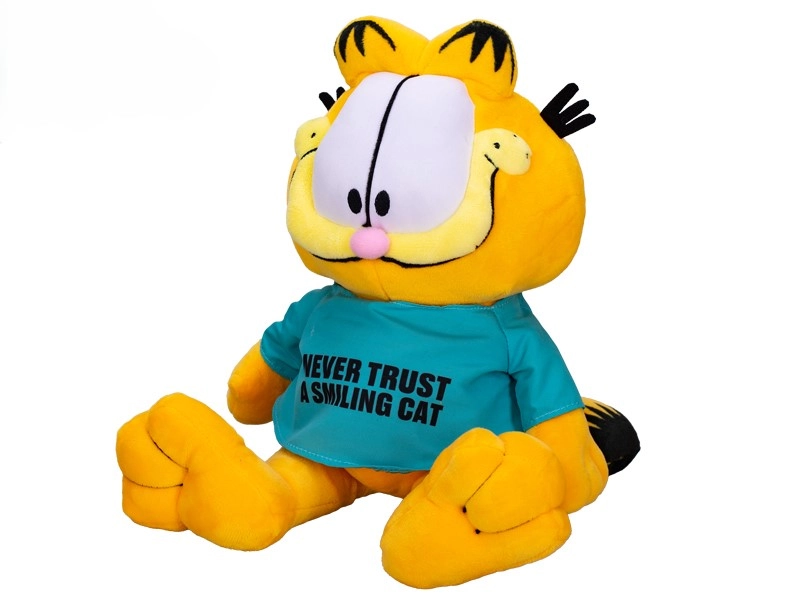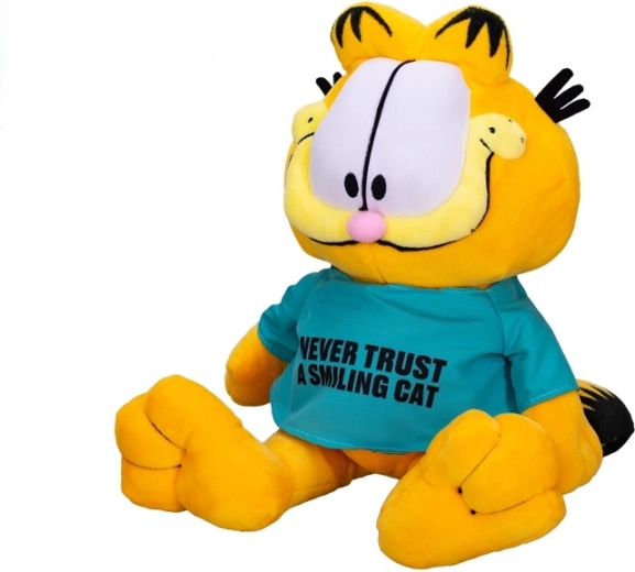 Privítajte do svojej zbierky alebo detskej izby legendárneho kocúra GARFIELD! Táto kvalitne spracovaná plyšová hračka v sediacej pozícii je vyrobená z jemného, hebkého plyšu, ktorý priamo láka k mojkaniu. Štýlové tričko s nápisom „Never trust a smiling cat“ dodáva hračke charakter a robí z nej skvelý darček pre malých aj veľkých fanúšikov.