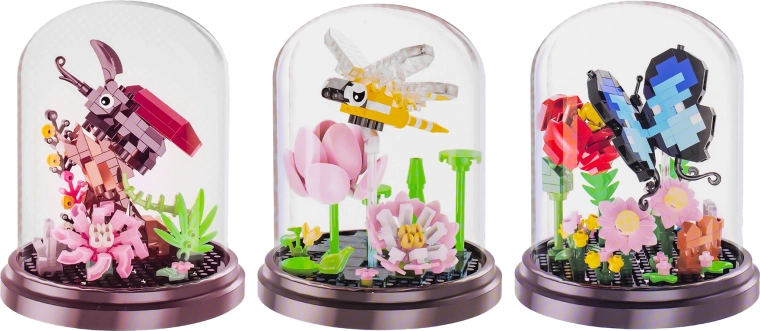 Kreatívna stavebnica pre deti od 6 rokov umožňuje zostaviť štyri druhy hmyzu s kvetom – motýľa, včelu, chrobáka a vážku. Sada s 253–281 dielikmi rozvíja jemnú motoriku, logické myslenie a trpezlivosť. Súčasťou je priehľadný kryt proti prachu na jednoduché vystavenie hotového modelu s rozmermi cca 11 × 8,6 cm.