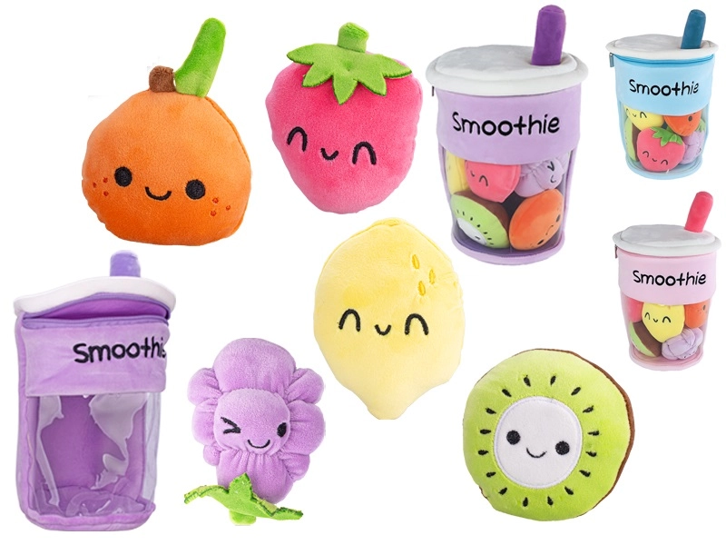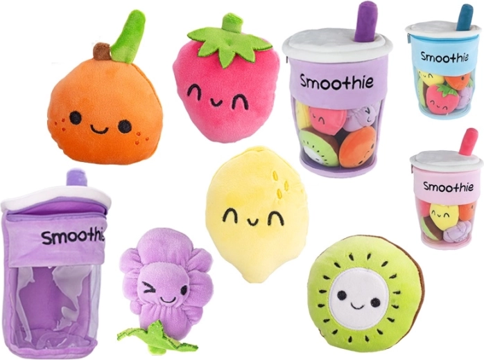 Roztomilý plyšový kelímok v tvare smoothie s výškou 33 cm ukrýva 5 odnímateľných kúskov ovocia pre zábavnú a interaktívnu hru. Vďaka zipsu na jednoduché otváranie si deti precvičia jemnú motoriku a užijú si bezpečné túlenie vďaka mäkkému plyšu. Vhodné od narodenia a dostupné v troch farbách: ružovej, fialovej a modrej.