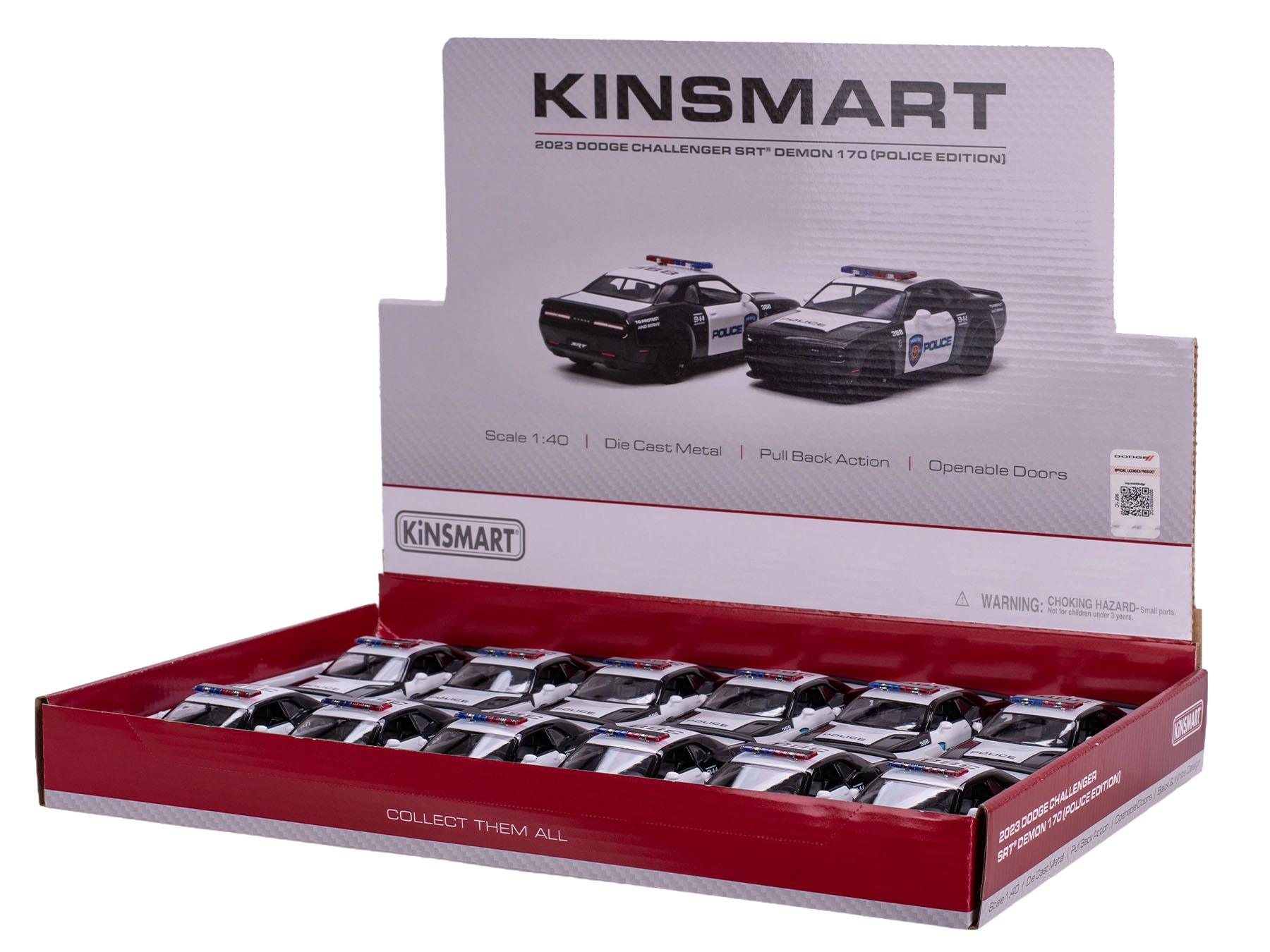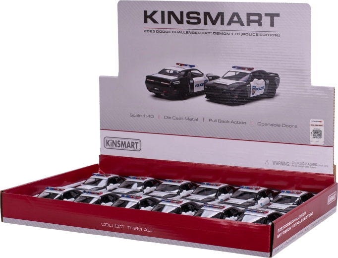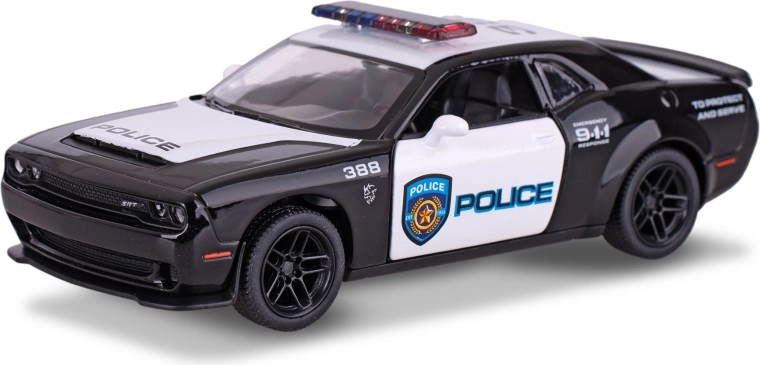 Detailne spracovaný kovový model Dodge Challenger SRT Demon 170 v policajnom prevedení od značky Kinsmart poteší deti aj zberateľov. V mierke 1:40 a s dĺžkou 13 cm ponúka realistické proporcie, spätné naťahovanie pre svižnú jazdu a otváracie dvere pre ešte vyššiu autentickosť. Odolná kombinácia kovu a plastu zaručuje dlhú životnosť a atraktívny vzhľad.