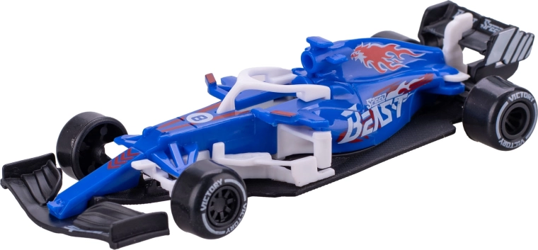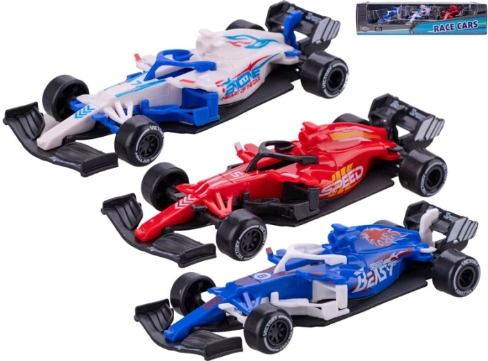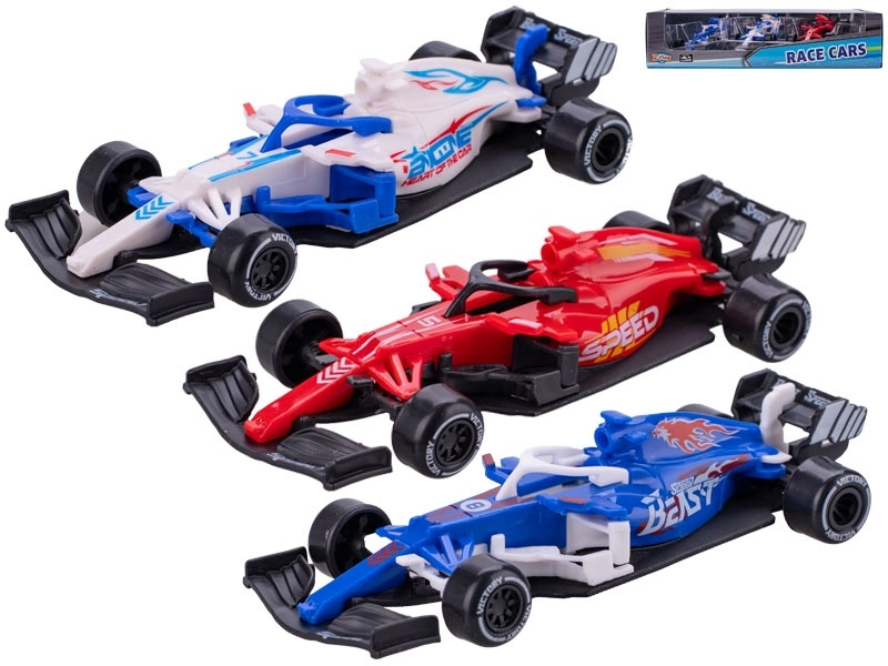 Štýlová sada troch modelov pretekárskych formulí poteší malých pretekárov aj zberateľov. Každý model s dĺžkou 12,5 cm má voľnobeh kolies pre plynulú jazdu, je vyrobený z odolného kovu s plastovými doplnkami a zaujme atraktívnym farebným prevedením. Balené v priehľadnej krabičke. Vhodné pre deti od 3 rokov.