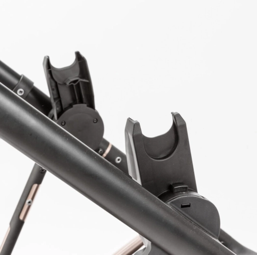 Zasuňte adaptéry do montážnych štrbín rámu kočíka, kým nezapadnú so zreteľným kliknutím, potom nacvaknite autosedačku. Pred každým použitím skontrolujte pevné spojenie. Na demontáž najprv zložte autosedačku podľa jej návodu a stlačte uvoľňovacie tlačidlo zámku adaptérov.