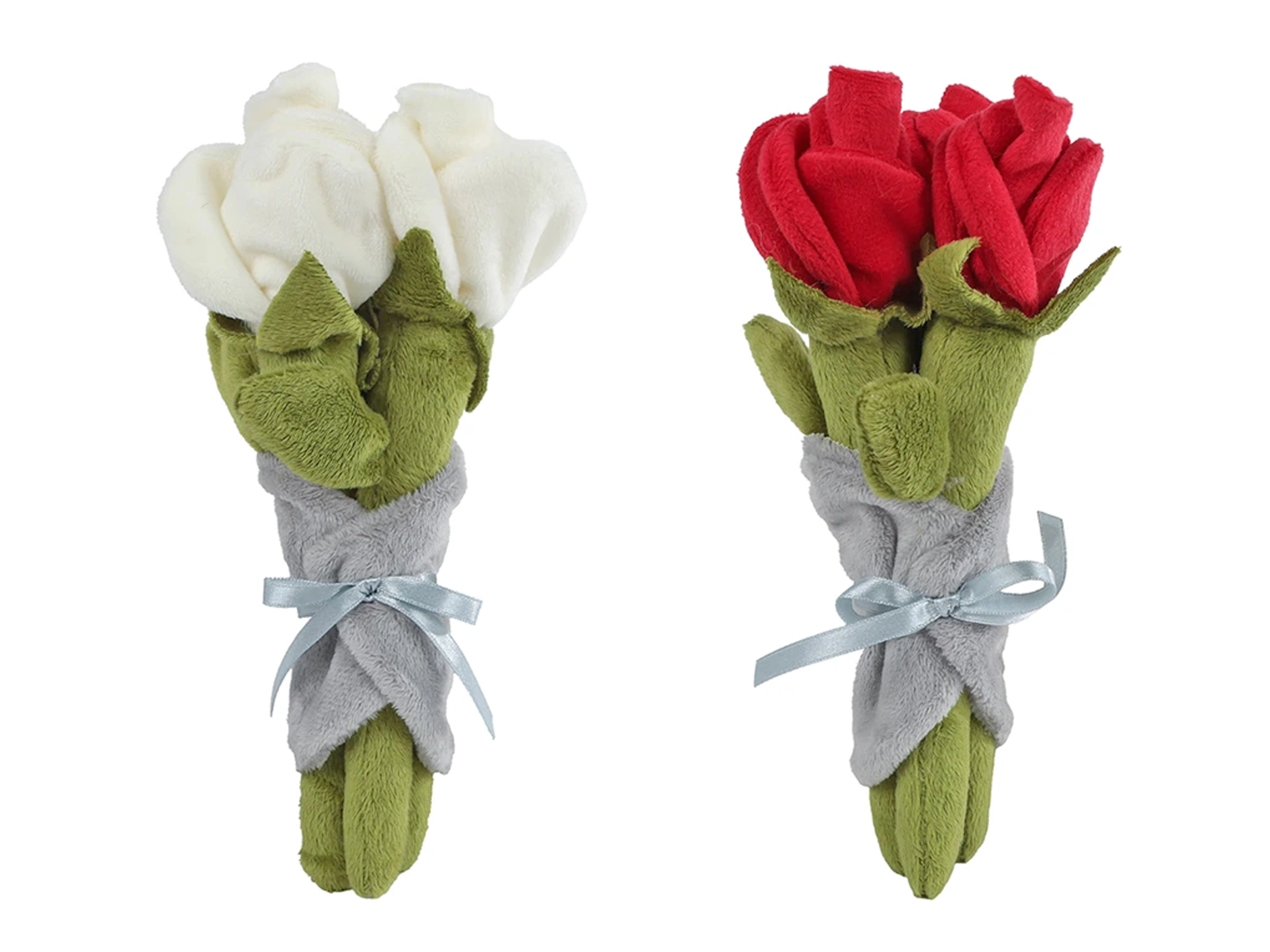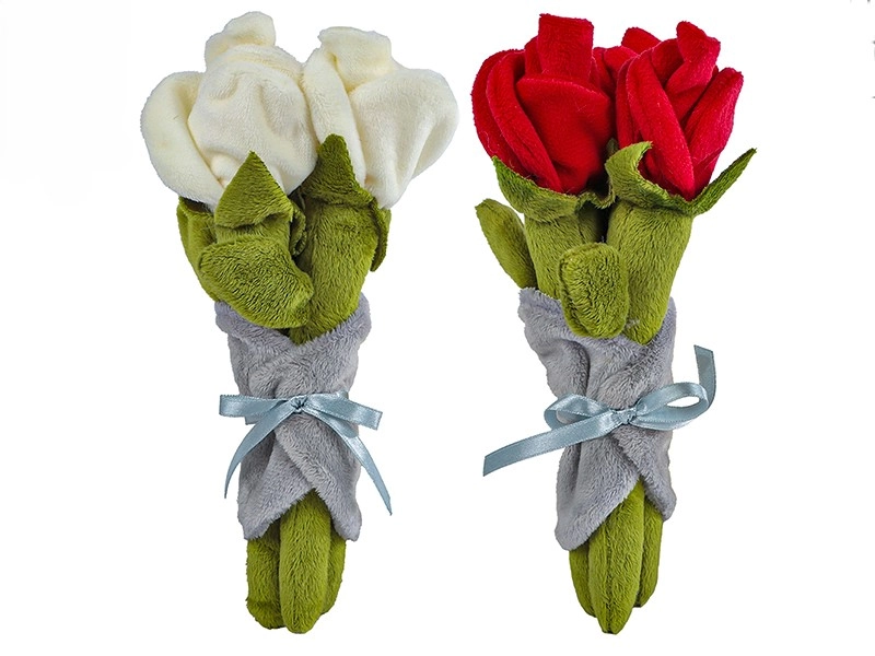 Originálny a trvalý darček, ktorý nikdy nezvädne. Tento rozkošný plyšový zväzok ruží s detailne spracovanými lístkami je elegantne zabalený do mäkkého sivého plyšu a previazaný saténovou mašľou. Je ideálny na vyjadrenie lásky, priateľstva alebo ako dekorácia do detskej izby. Dostupný v dvoch farbách – biela a červená. Bezpečné vyhotovenie je vhodné pre deti od narodenia.