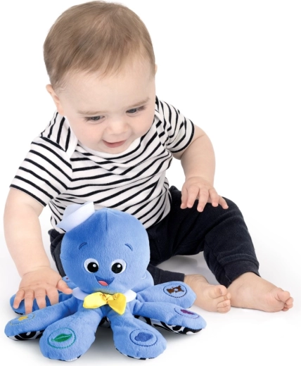 Roztomilá chobotnička Octoplush od BABY EINSTEIN prináša deťom od 3 mesiacov zábavu aj učenie v jednom. Každé stlačenie mäkkých nožičiek spúšťa krátke klasické melódie a pomenovania farieb v troch jazykoch (EN/ES/FR). Mäkučké prevedenie pozýva k maznaniu, zatiaľ čo kontrastné vzory a výšivky podporujú zmyslový rozvoj, jemnú motoriku a vnímanie farieb. Vďaka ovládaniu hlasitosti a jednoduchej údržbe je ideálny parťák na každodenné hranie.