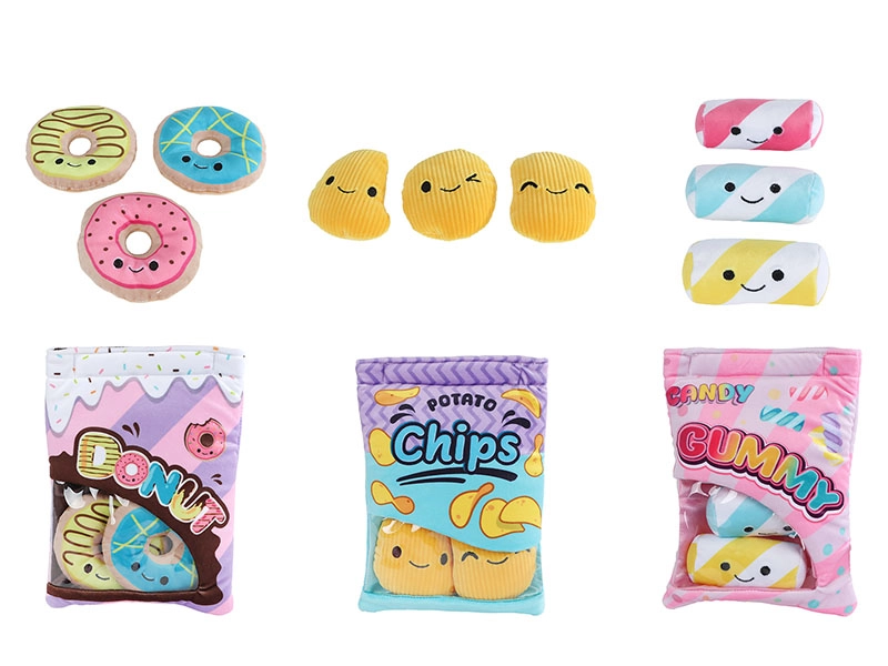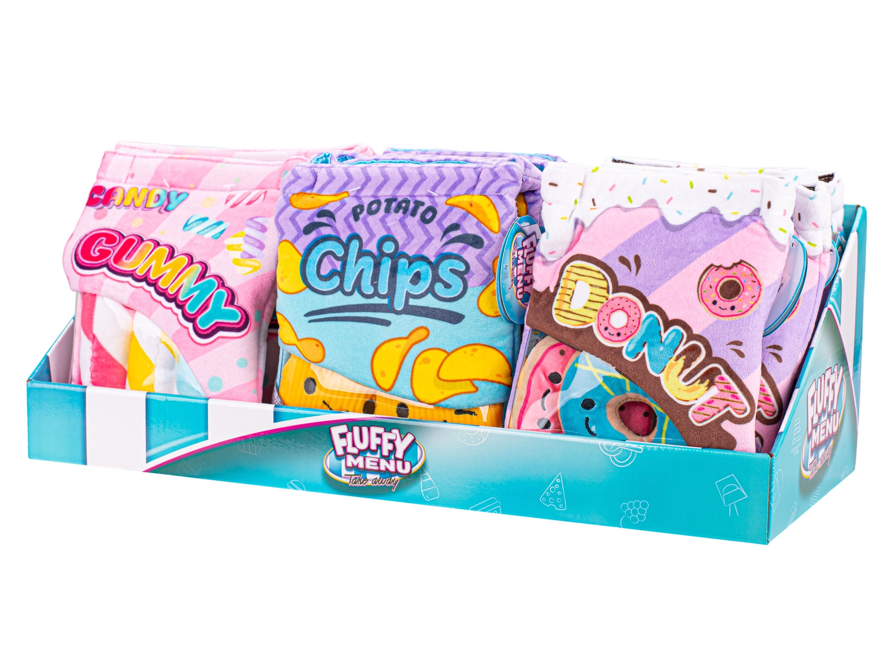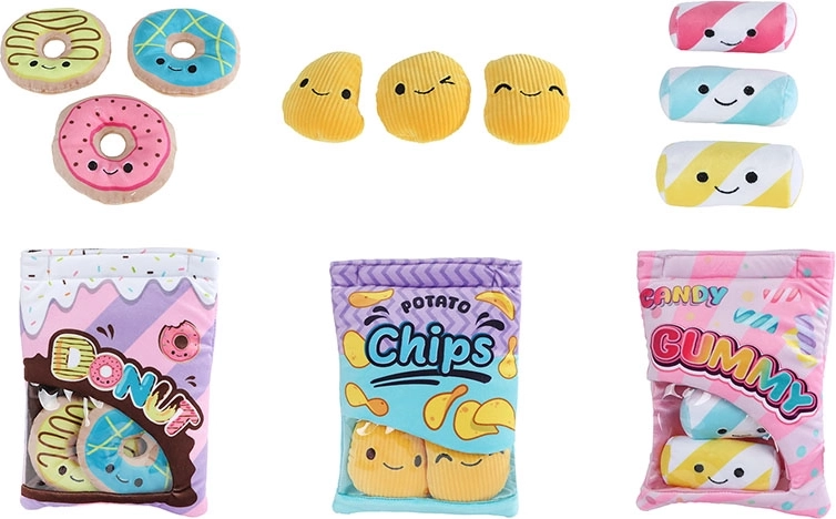 Vo vnútri každého vrecúška sa nachádza plyšová desiata – vyberať môžete z variantov čipsy, donuty a želé. Vďaka rozmerom približne 16 × 8 × 6 cm skvele padne do malých ručičiek a vďaka dĺžke 21 cm sa ľahko prenáša. Je to tiež praktický darček na každú príležitosť.