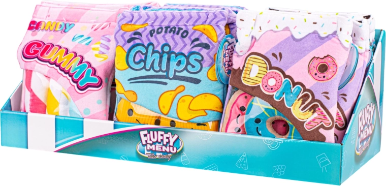 Roztomilé plyšové vrecúško Fluffy Menu s veselými tváričkami prináša deťom zábavu, pohodlie na dotyk a bezpečné hranie od narodenia. V každom vrecúšku sa ukrýva plyšová desiata vo variantoch čipsy, donuty alebo želé. Vďaka kompaktným rozmerom sa skvele zmestí do batôžka či kočíka a je tak ideálne na cesty.