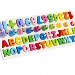 abeceda (A–Z), čísla (1–10), matematické znaky, plastové krúžky, drevená doska s kolíkmi