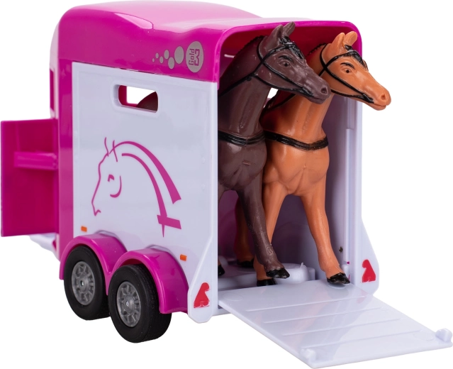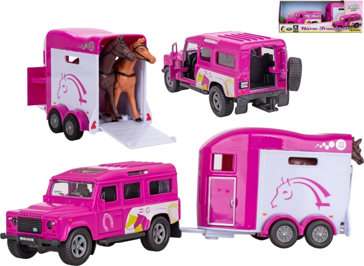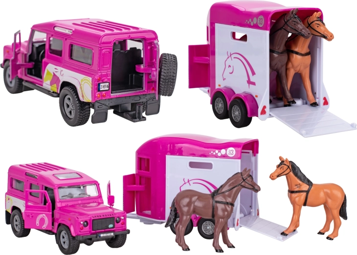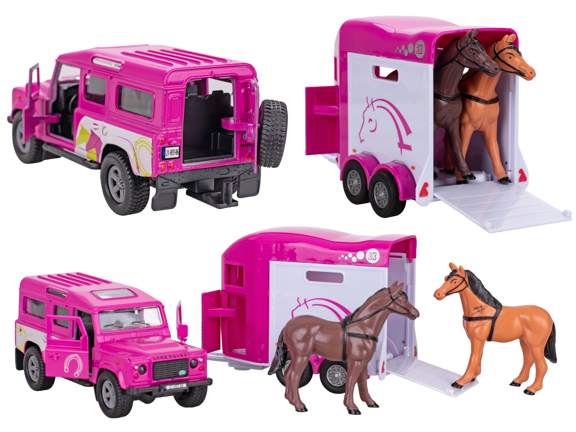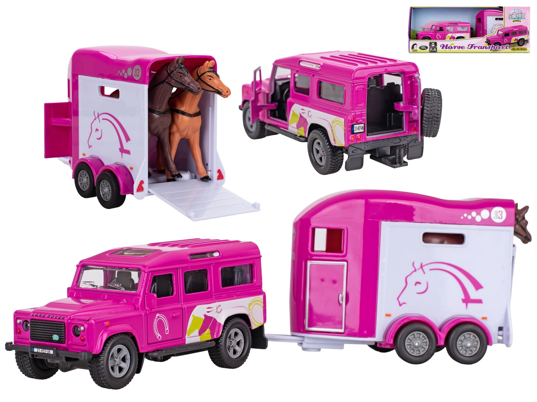 Štýlový kovový model Land Rovera s prívesom pre kone v ružovej farbe poteší všetky malé milovníčky jazdy a farmy. Ponúka spätný chod pre ľahkú jazdu, otvárateľné predné dvere a odolné vyhotovenie z kovu a plastu. Príves je pripravený na bezpečnú prepravu figúrok koní (nie sú súčasťou balenia). Dĺžka súpravy 28 cm a balenie v krabičke z neho robia skvelý darček pre deti od 3 rokov.