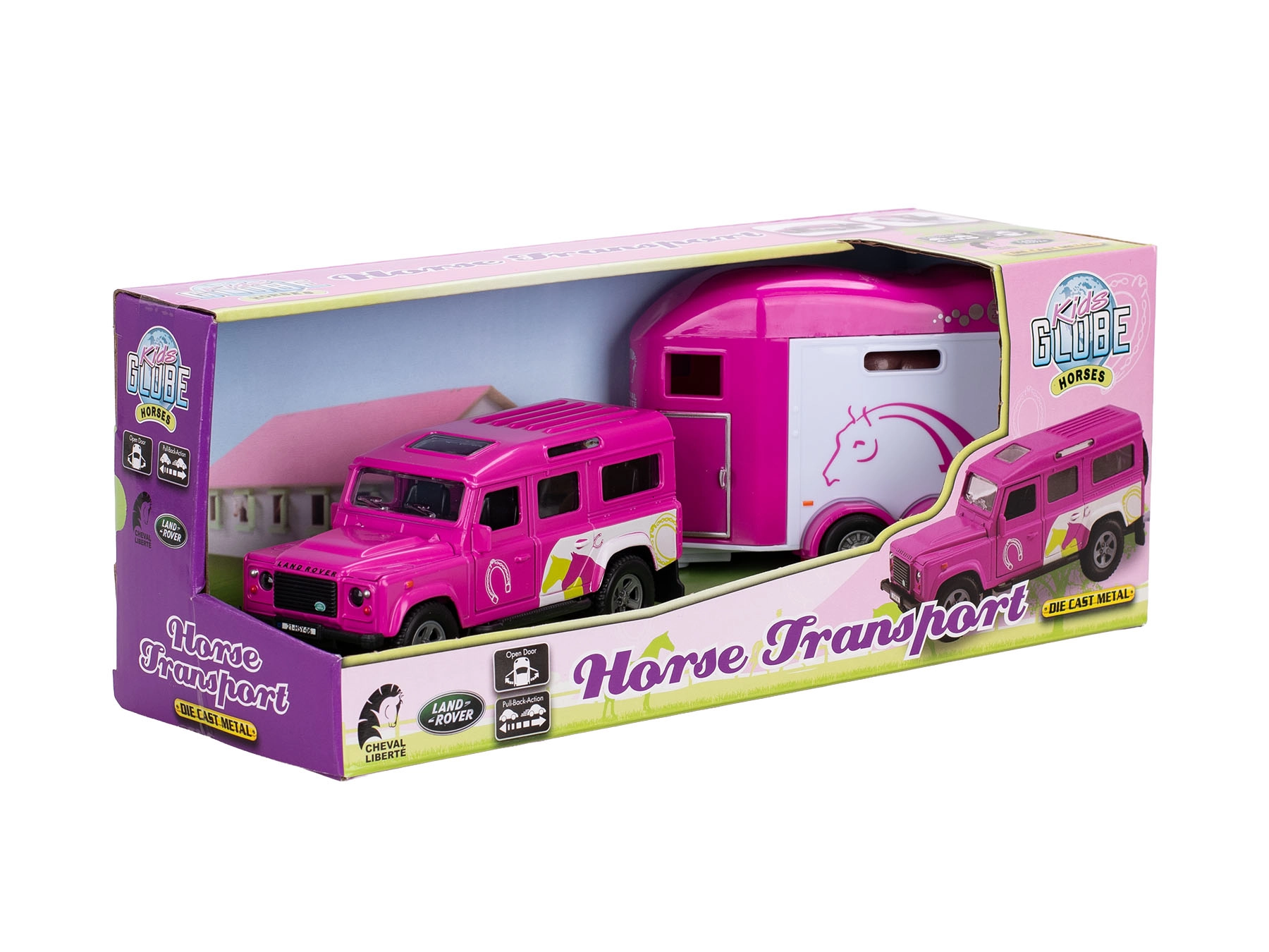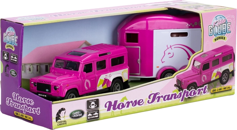 Objavte realistickú súpravu Kids Globe s ikonickým vozidlom Land Rover a prívesom na prepravu koní v atraktívnej ružovej farbe. Detailné prevedenie karosérie aj interiéru, otvárateľné predné dvere a spätný chod zaručujú množstvo herných možností a zábavy. Vďaka kombinácii kovu a kvalitného plastu je model odolný a pripravený na každodenné hranie.
