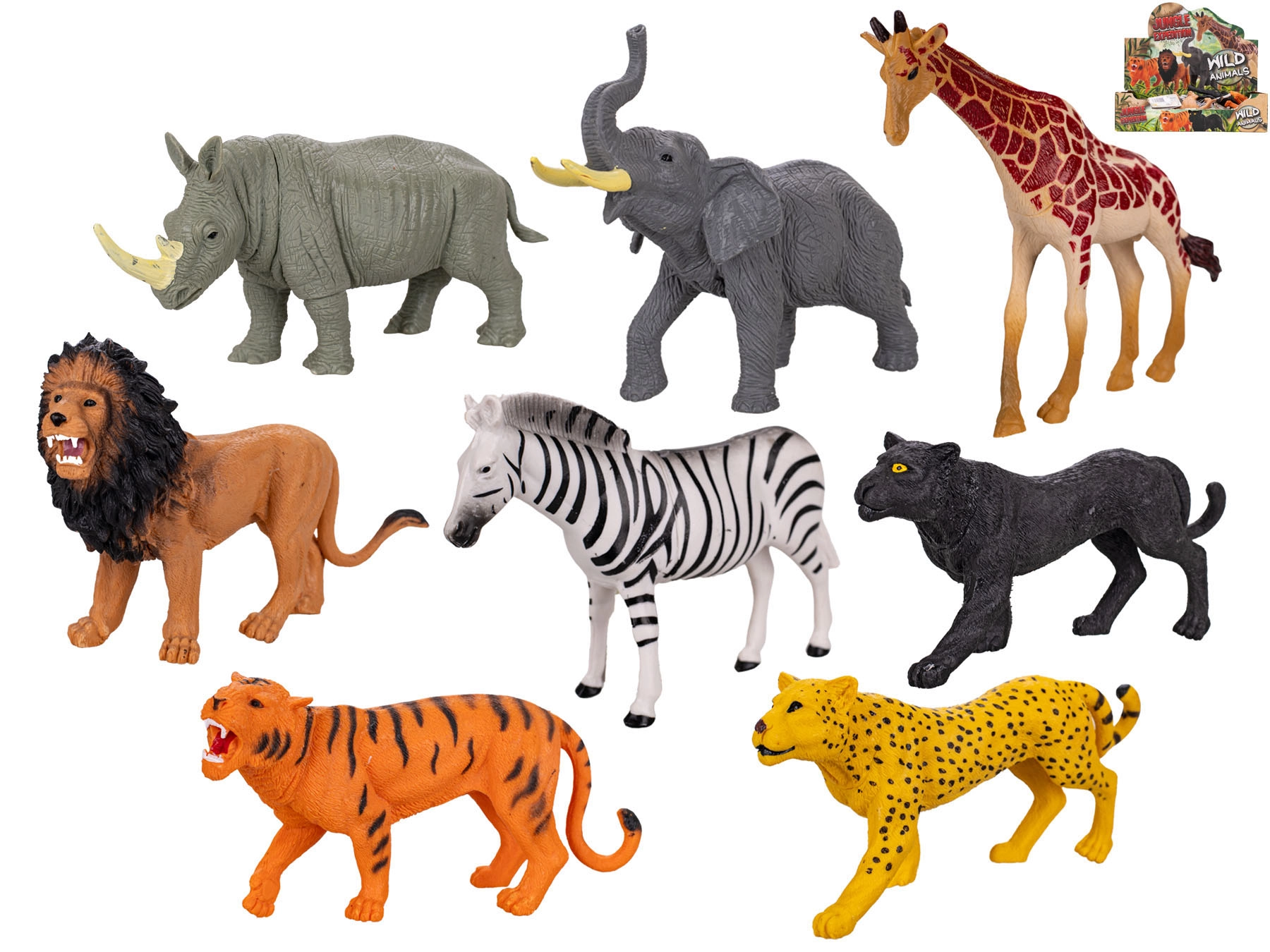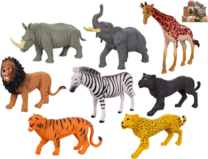 • 8 realistických figúrok: zebra, žirafa, tiger, jaguár, leopard, nosorožec, lev a slon