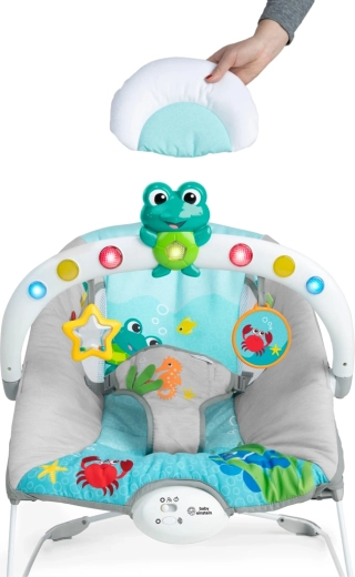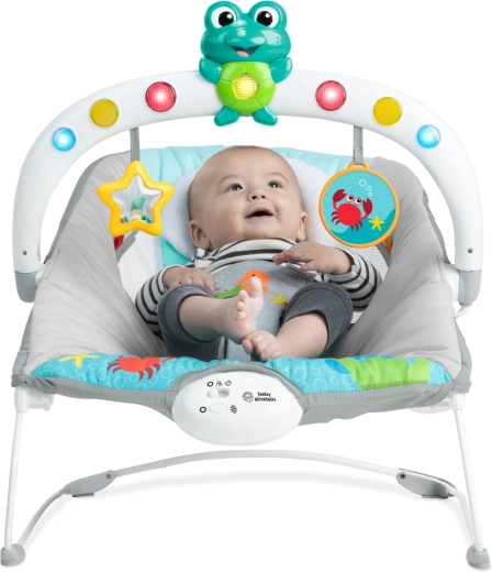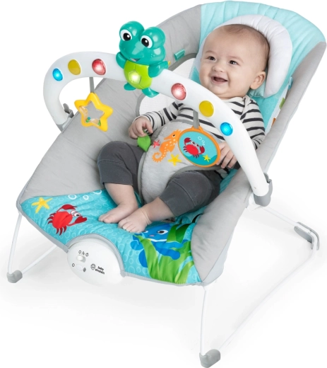 Ležadlo BABY EINSTEIN Ocean Explorers Kick to It Neptune je navrhnuté na upokojenie aj zmyslovú stimuláciu. Interaktívna hračka so žabkou a zrkadielkom, hrkálka v tvare hviezdičky a farebné stužky podporujú jemnú motoriku, vizuálne vnímanie a sebapoznávanie. Integrované vibrácie a melódie pomáhajú bábätko utíšiť, zatiaľ čo stabilná konštrukcia a bezpečnostné pásy poskytujú istotu pri odpočinku aj hre.