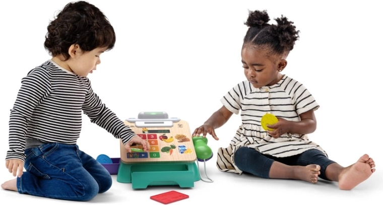 Súčasťou je ručný skener, karta a 3 mince, ktoré podnecujú predstavivosť pri hre na obchod. Malé rozmery a integrované úložisko v peňažnej zásuvke uľahčia prenášanie aj upratovanie. Kombinácia dreva s certifikáciou FSC a kvalitných plastov je bezpečná, odolná a ideálna na každodenné hranie.