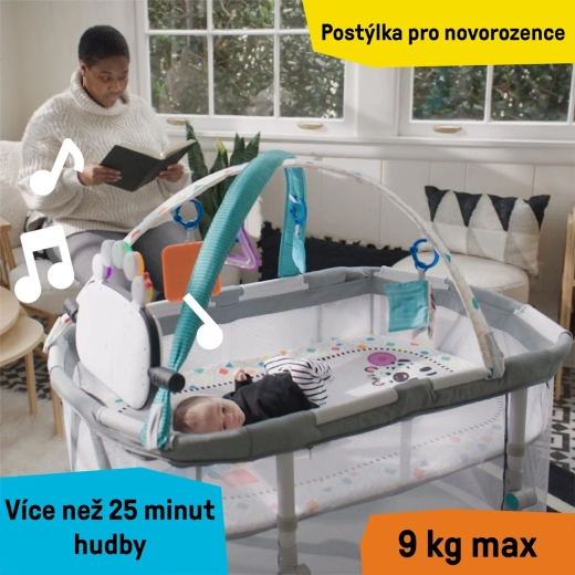 Odstráňte matrac a premeňte postieľku na hraciu podložku. Interaktívny klavír ponúka 70+ melódií a fráz v 4 jazykoch, visiace hračky a zrkadielko podporujú motoriku a objavovanie.