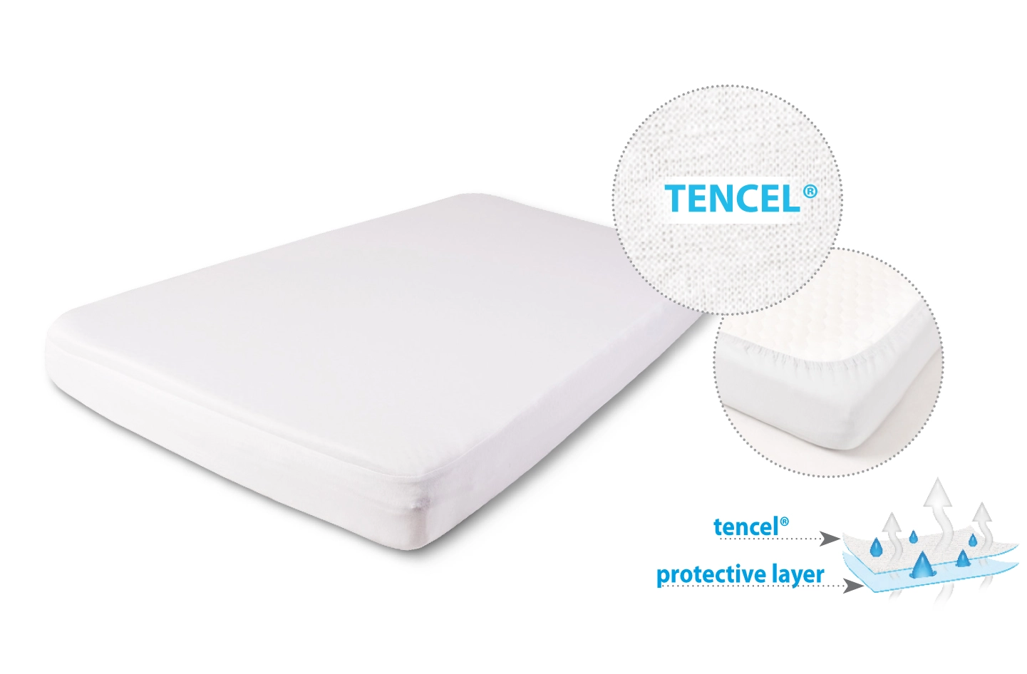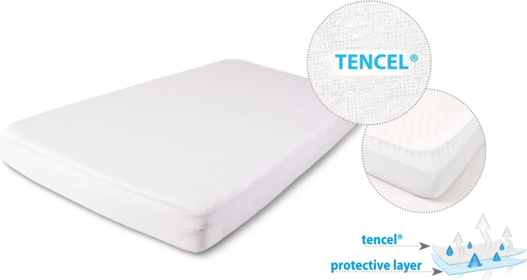 Obojstranná napínacia plachta z prírodného vlákna Tencel spája jemnosť hodvábu a vysokú savosť s odolnosťou a jednoduchou údržbou. Spodná vrstva z priedušnej PU membrány neprepustí tekutiny, ale umožní matracu dýchať – ideálna voľba pre deti aj citlivých alergikov.
