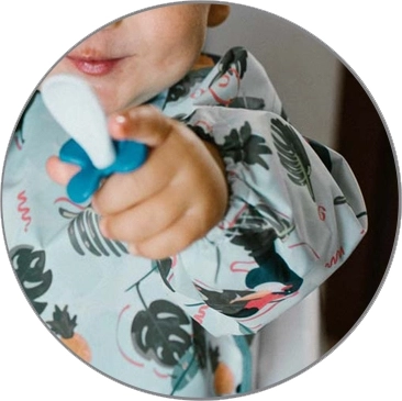Zapínanie na suchý zips umožňuje rýchle prispôsobenie obvodu krku, zatiaľ čo pružné gumičky v manžetách dobre tesnia okolo zápästí. Priestranné vrecko na prednej strane zachytí zvyšky jedla a kvapky, čím zjednoduší upratovanie po každom kŕmení.