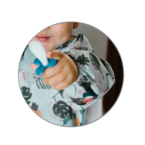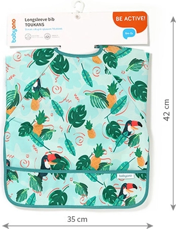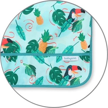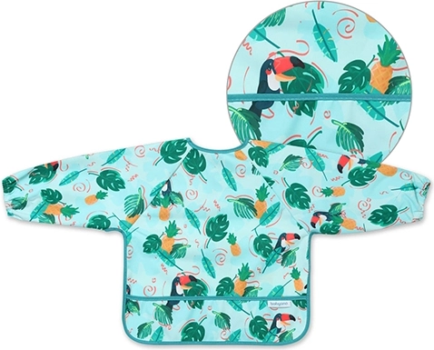 Štýlový a funkčný podbradník s potlačou tukanov poskytuje celo plošné krytie trupu aj rukávov, takže oblečenie zostane čisté pri každom jedení aj neporiadnej hre. Vďaka vodoodolnému a ľahko umývateľnému materiálu je ideálny na prvé samostatné kŕmenie aj kreatívne aktivity.