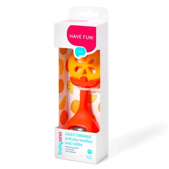 Multifunkčné hryzátko a hrkálka v tvare pomaranča od BabyOno prináša úľavu pri prerezávaní zúbkov a zároveň podporuje rozvoj zmyslov. Vďaka mäkkému elastickému materiálu s textúrovaným povrchom jemne masíruje ďasná, zatiaľ čo ľahká a ergonomická rukoväť je ideálna pre malé rúčky. Vo vnútri ukryté koráliky príjemne hrkajú, motivujú ku hre a precvičujú úchop.