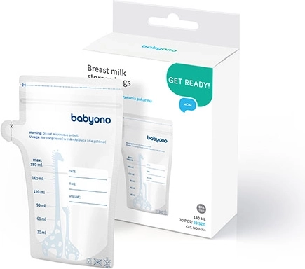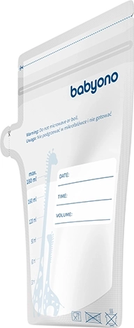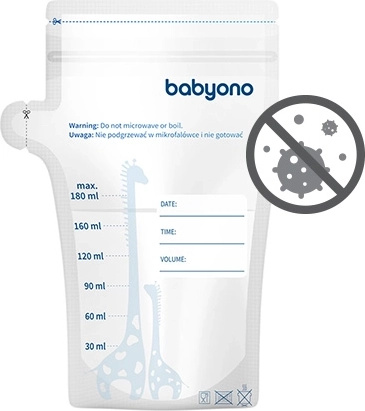Jednorazové sáčky na materské mlieko BABYONO s objemom 180 ml zabezpečia bezpečné a hygienické skladovanie aj mrazenie. Majú nepriepustný zips, stabilné samostatne stojace dno, presnú mierku a miesto na popis (dátum, čas, množstvo). Špeciálne tvarovaná lieviková nálevka uľahčuje nalievanie do fľaše a sterilizácia gama lúčmi garantuje najvyššie hygienické štandardy.