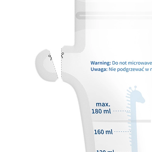 Praktická nálevka zjednodušuje presné a čisté preliatie mlieka do fľaštičky. Na prednej strane je jasná stupnica do 180 ml a popisové pole pre dátum a čas odsatia. Sáčky sú sterilizované gama žiarením, čo zaisťuje vysokú úroveň hygieny pre vaše bábätko.