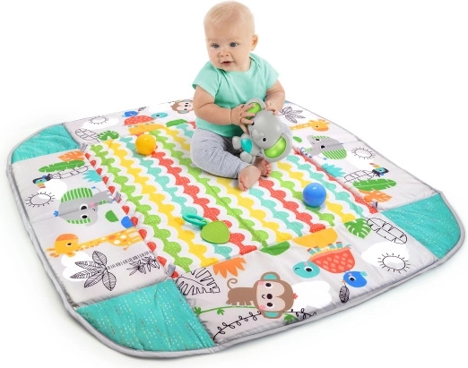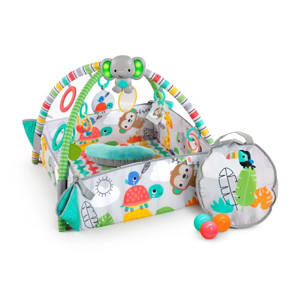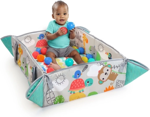 Táto multifunkčná hracia deka BRIGHT STARTS Your Way Ball Play Totally Tropical premení každú oddychovú chvíľku na zmyslové dobrodružstvo. Vďaka nastaviteľným bočniciam ju počas sekundy zmeníte na ohrádku či ball pit a loptičky tak zostanú pekne pokope. Dve mäkké oblúkové hrazdičky s hračkami na C-krúžkoch lákajú k naťahovaniu, úchopu aj pozorovaniu a podporujú hrubú aj jemnú motoriku.