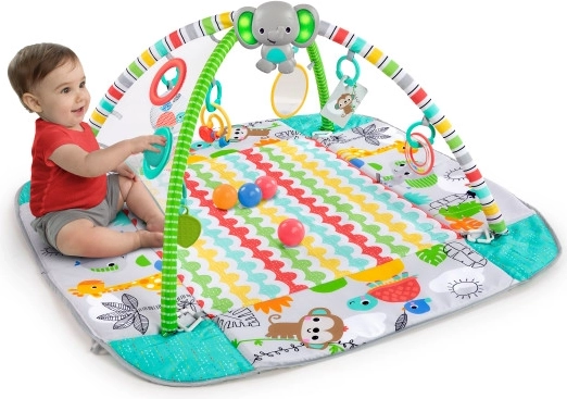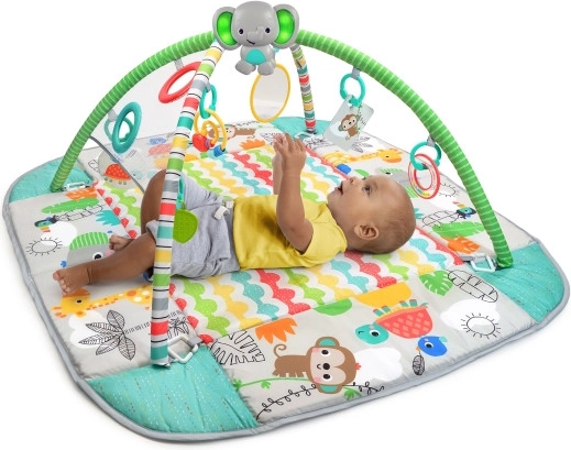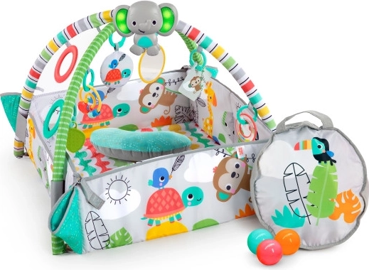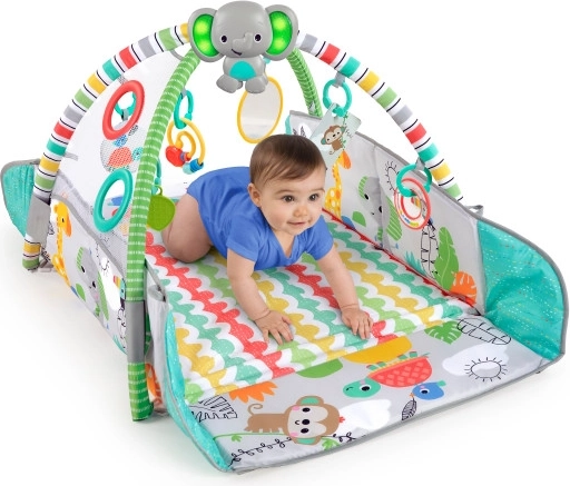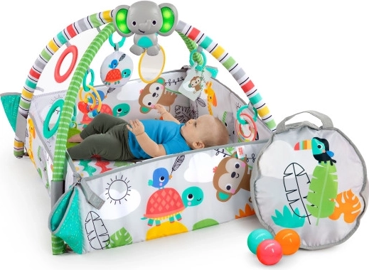 Objavte univerzálnu hraciu deku 5v1, ktorá rastie s vaším bábätkom od narodenia. Ponúka priestorovú plochu 113 cm, mäkké sklopné bočnice na vytvorenie ohrádky, až 40 farebných loptičiek pre nekonečnú zábavu a 2 hrazdičky s odnímateľnými hračkami. Hudobný slon so svetlami zabaví viac než 20 minút a podporí zmyslový rozvoj a motoriku pri hre na chrbátiku aj na brušku.