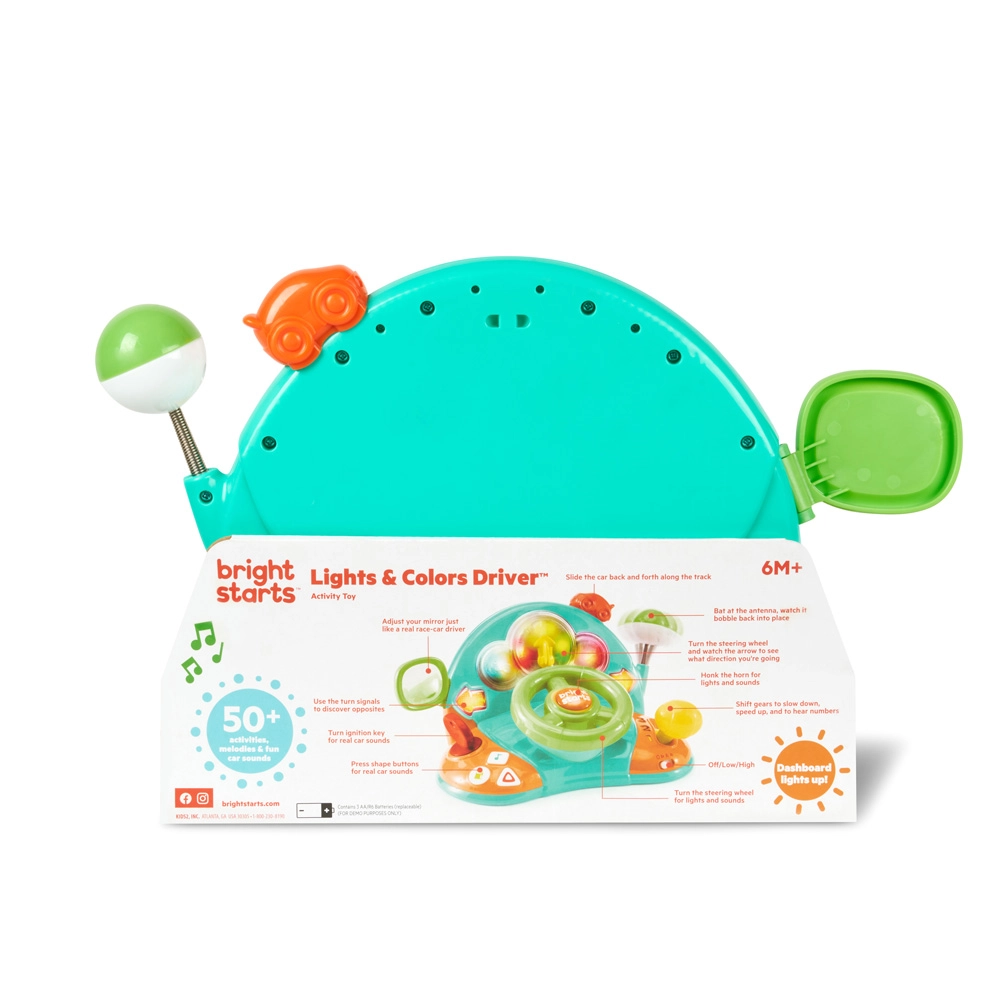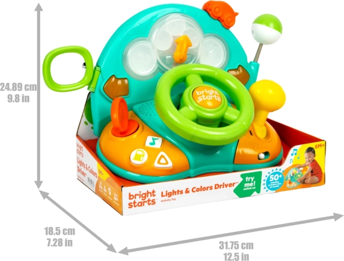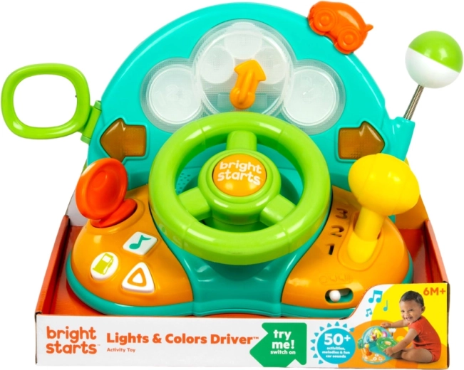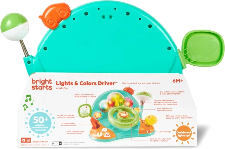 Rozbehnite zábavu s interaktívnym volantom BRIGHT STARTS Lights & Colors Driver, ktorý ponúka svetelné efekty, realistické zvuky auta a melódie. Deti si zamilujú otáčanie volantom, radenie rýchlostí a blikajúce smerovky, ktoré podporujú jemnú motoriku, učenie tvarov a čísel a kreatívnu hru.