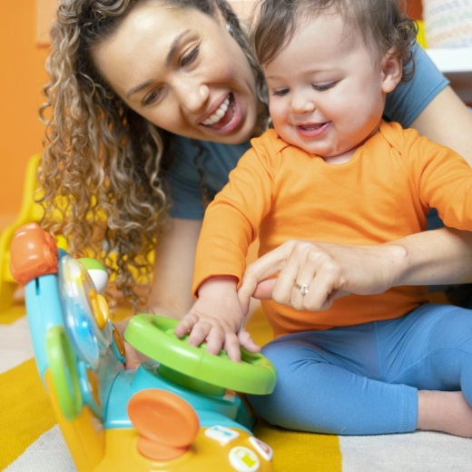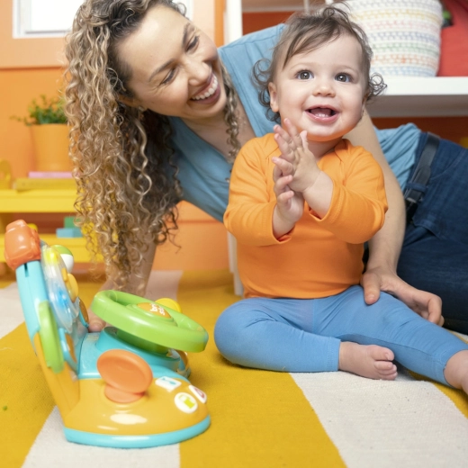Hračka je navrhnutá pre malé ruky – veľký zelený volant sa ľahko drží a ovláda. Otočné prvky, páčky a tlačidlá posilňujú jemnú motoriku a koordináciu oko–ruka, zatiaľ čo zábavné melódie a „autorádio“ povzbudzujú vnímanie rytmu a rané objavovanie hudby. Ideálne na hranie na podlahe aj na stolíku.