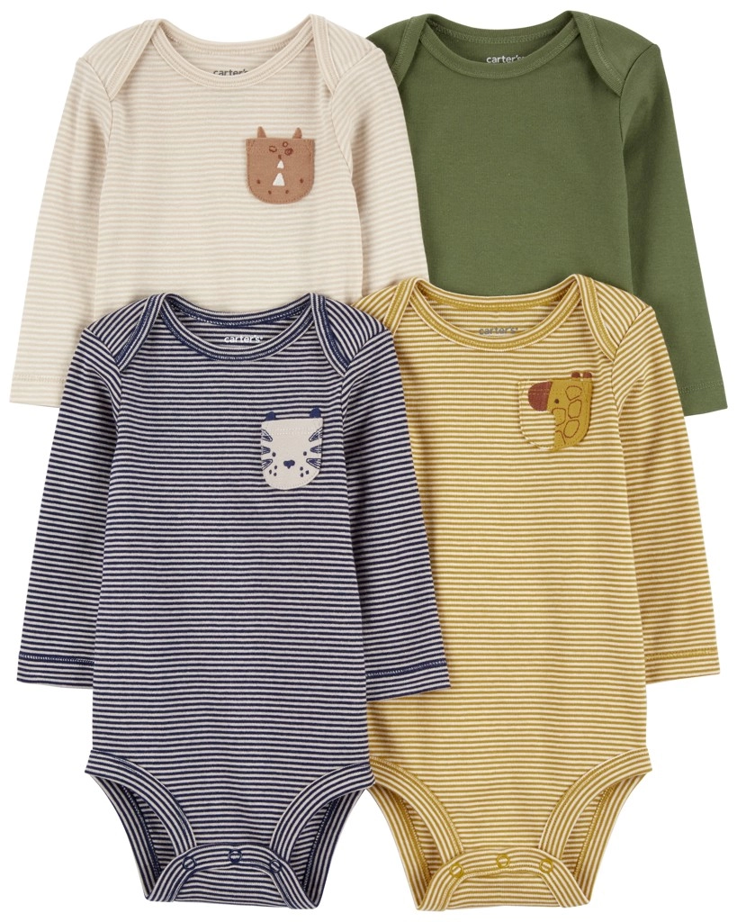 Sada 4 detských body s dlhým rukávom v moderných tónoch námorníckej modrej a olivovej s veselými zvieracími motívmi je navrhnutá pre maximálny komfort najmenších. Mäkká, priedušná a k citlivej pokožke šetrná 100% bavlna zabezpečuje celodenné pohodlie, zatiaľ čo odolný spevnený výstrih drží tvar aj po častom praní.