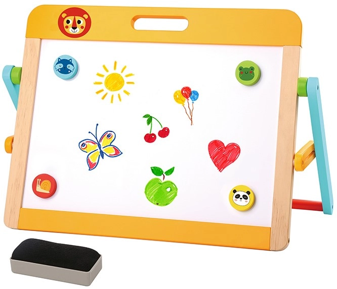 Súčasťou balenia sú kriedy a magnetické fixky, takže deti môžu začať tvoriť ihneď po rozbalení. Kvalitná drevená konštrukcia zaisťuje stabilitu a dlhú životnosť, vhodnú na každodenné používanie.