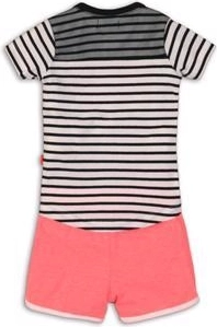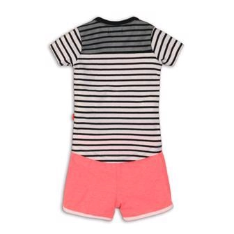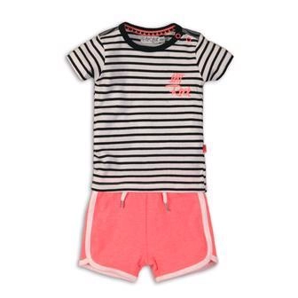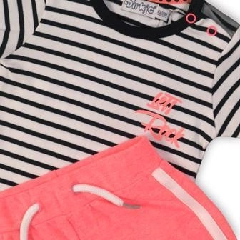 Oblečte svoje dieťa do pohodlia a štýlu so setom DIRKJE, ktorý kombinuje praktičnosť a roztomilý dizajn. Pruhované tričko v bielo‑čiernej farbe s drobným ružovým motívom dopĺňajú ružové šortky s bielym lemom. Vďaka mäkkej bavlne a prímesi elastanu sa oblečenie krásne prispôsobí a neobmedzuje v pohybe.