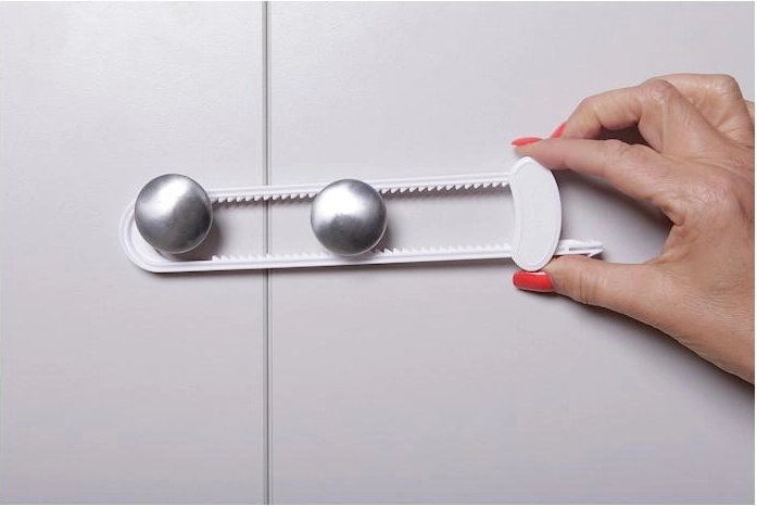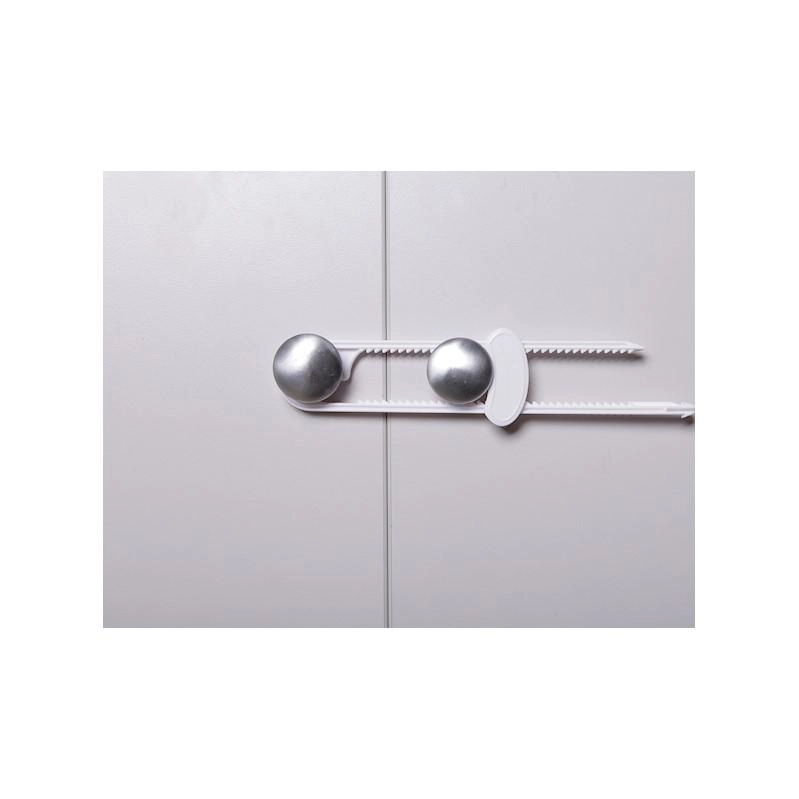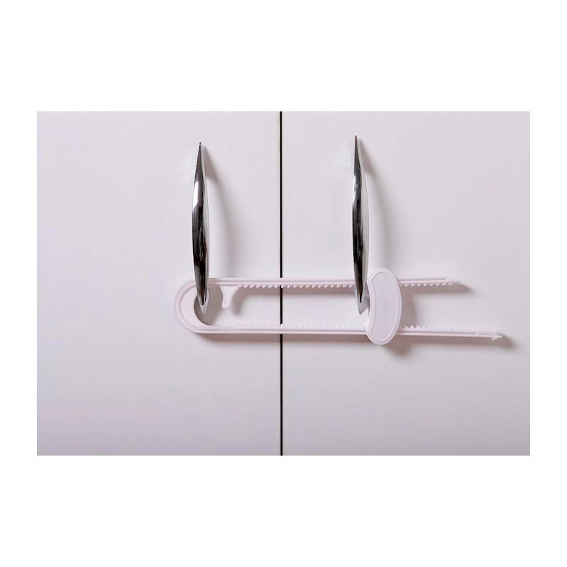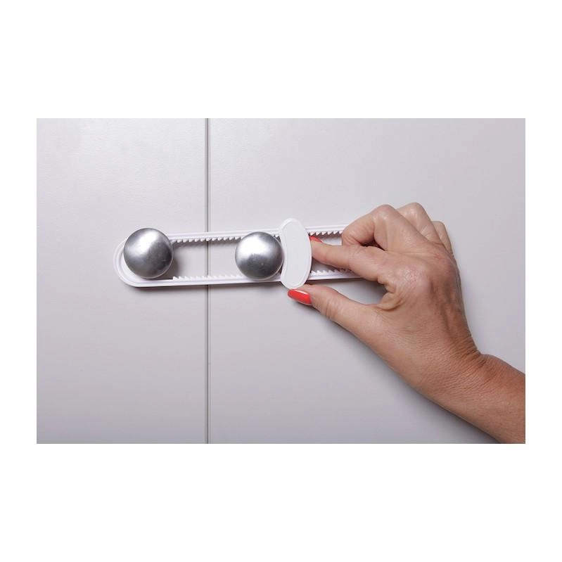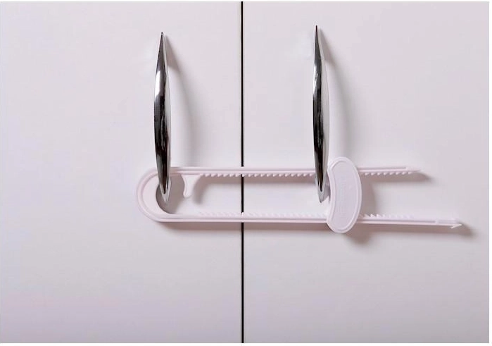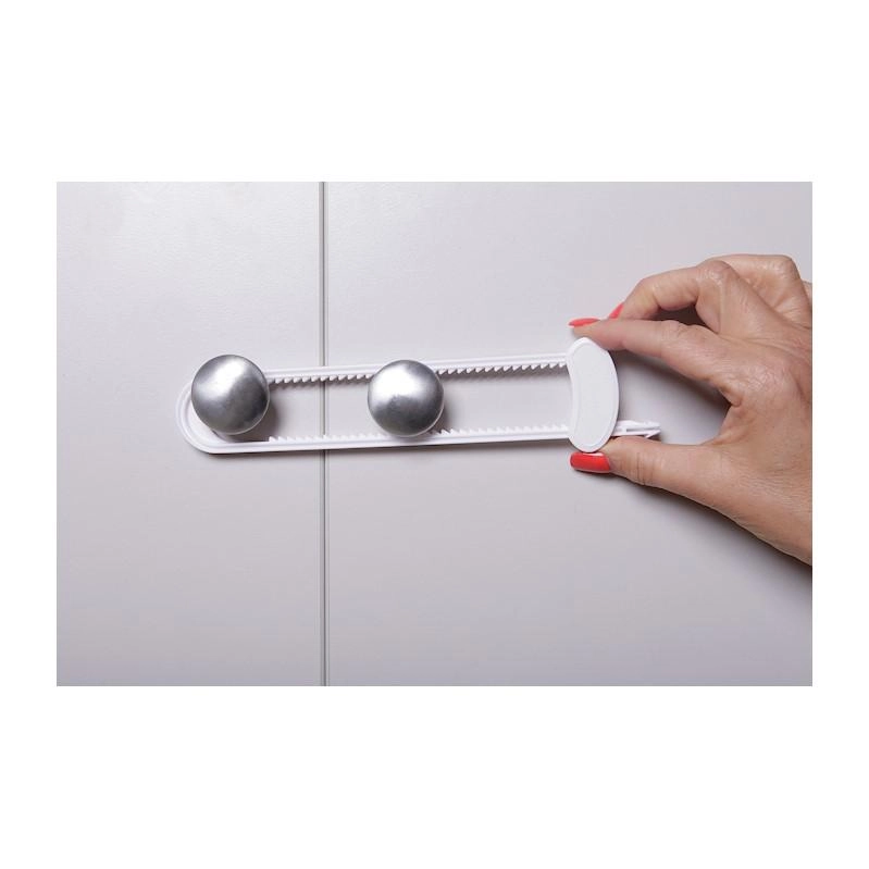 Zámok sa prispôsobí rôznym roztečiam dvojitých madiel a okrúhlych gombíkov, takže skvele funguje na väčšine kuchynských a kúpeľňových skriniek.