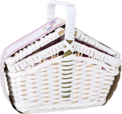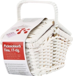 Biely prútený kôš ponúka úložný priestor pre celý set, pričom jeho pevná konštrukcia a dekoratívny prvok dodávajú autentický pocit pikniku.