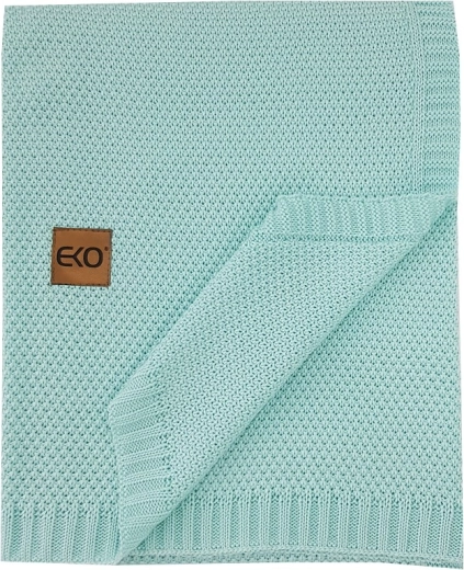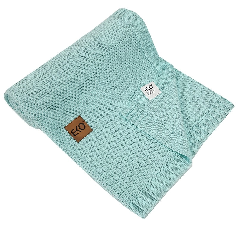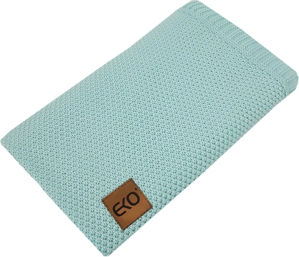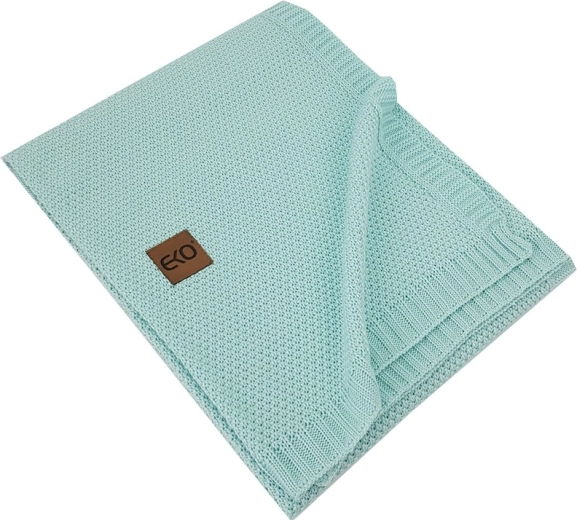 Moderný pletený vzor s decentným štítkom EKO a rozmer 100 × 80 cm do kočíka, postieľky aj na cestovanie.