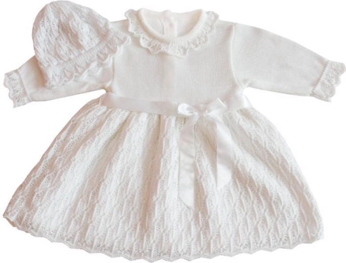 Táto slávnostná dievčenská súprava na krst kombinuje nadčasovú eleganciu a komfort. Pletené šaty s jemným ažúrovým vzorom dopĺňa ladiaca čiapočka, ktorá chráni hlavičku bábätka. Vďaka kvalitnej zmesi vlákien je komplet príjemný na dotyk, vzdušný a vhodný na celodenné nosenie počas významného dňa.